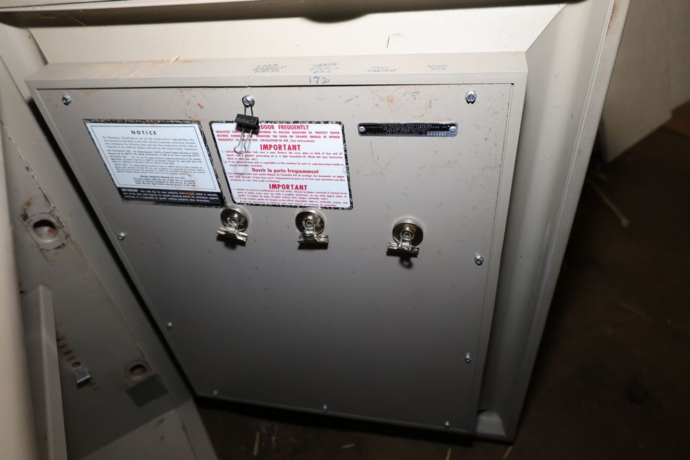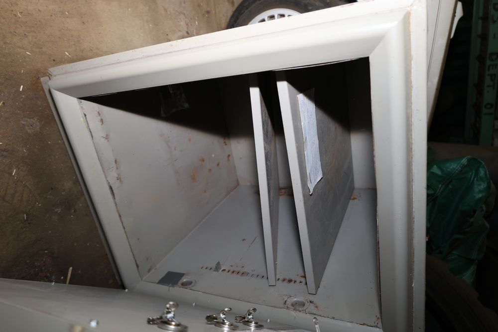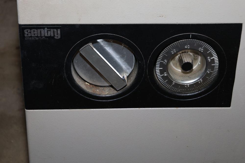 Sentry Safe With Combination, Measuring 27"L x 23"W x 29.5"T. Features two interior shelves and a front combination lock mechanism. Exterior and interior show signs of wear and light rust but remain functional. Pickup only.