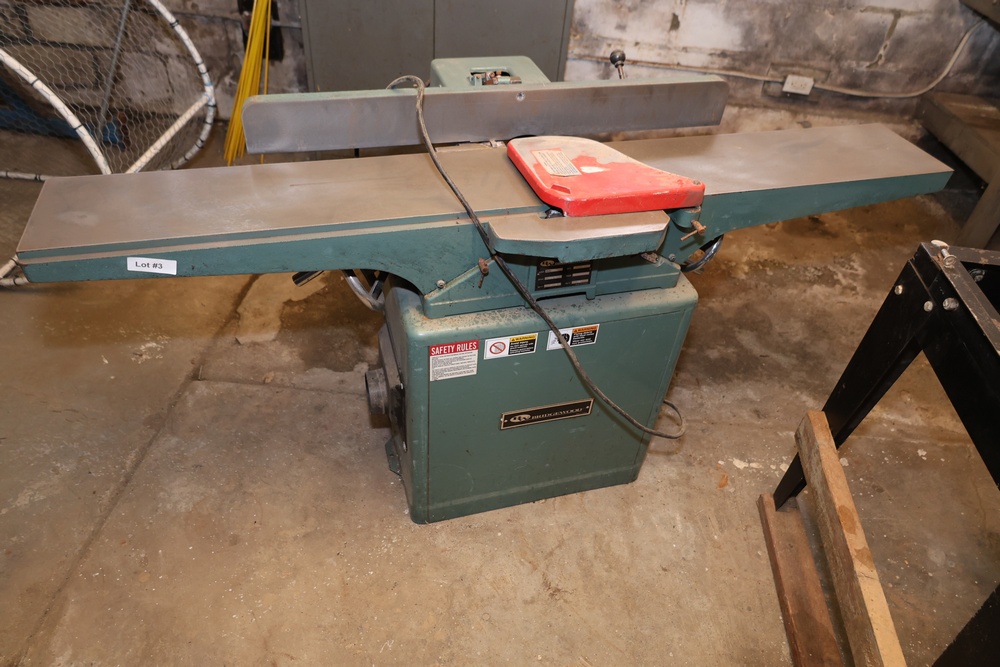 Bridgewood model BW8J jointer, single-phase 230V, 1.5HP motor, made in Taiwan. Features an 8" cutting width capacity with precision-ground cast-iron infeed and outfeed tables, adjustable fence with tilt controls, and handwheel height adjustment. Equipped with a cutter head guard, belt-driven motor system, and power switch with safety cover. Designed for jointing and edge-flattening operations in woodworking and furniture fabrication.