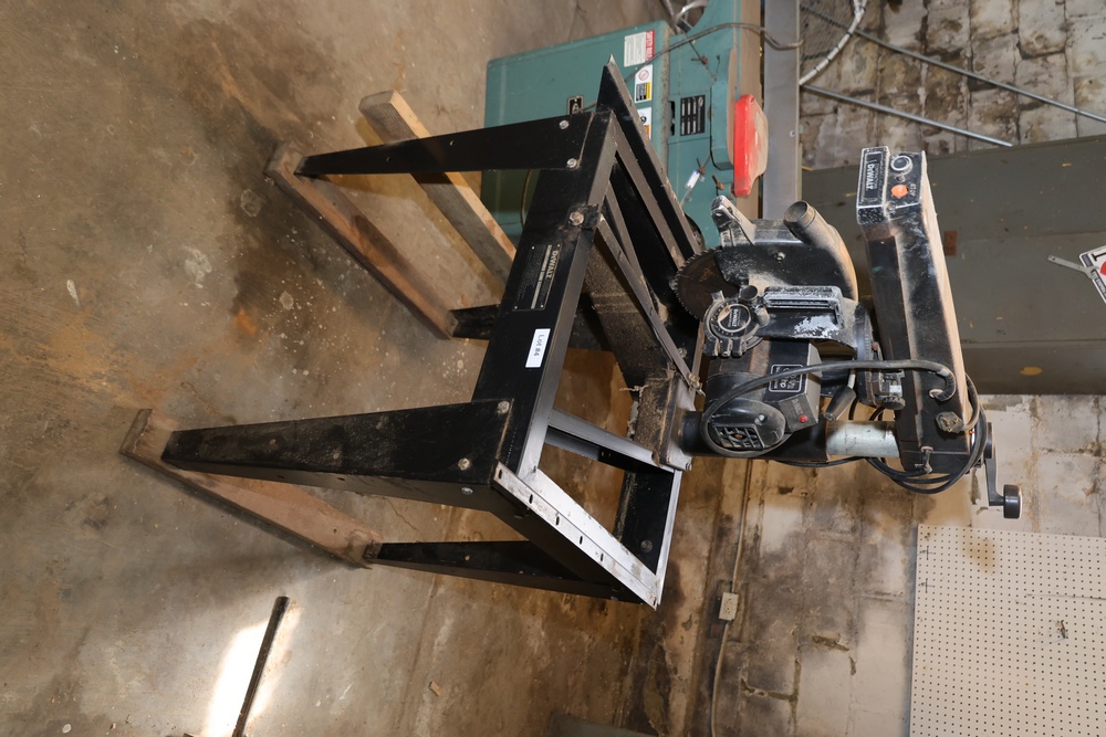 DeWalt model 7790 12" radial arm saw, 3½ HP dual-voltage motor with automatic brake, mounted on a heavy-duty steel stand. Features adjustable arm with bevel and miter capability, 12" (300mm) blade capacity, and cutting depth up to approximately 4" (102mm). Equipped with Contractor’s PowerShop controls, angle gauge, and integrated handle adjustments for precision crosscuts, bevels, and compound miters. Designed for woodworking, framing, and general shop applications.