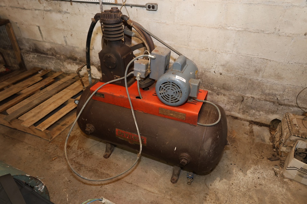 DeVilbiss air compressor, model 130, type UDM 5004-4, manufactured by The DeVilbiss Company, Toledo, Ohio, USA. Equipped with a single-stage, belt-driven pump rated for 900 max RPM and up to 150 PSI operating pressure, mounted on a horizontal air storage tank. Driven by an electric motor through a pulley system with mechanical control box and pressure switch. Features cast iron compressor housing, twin-cylinder design, and vintage DeVilbiss badging.