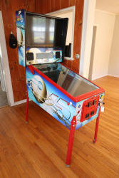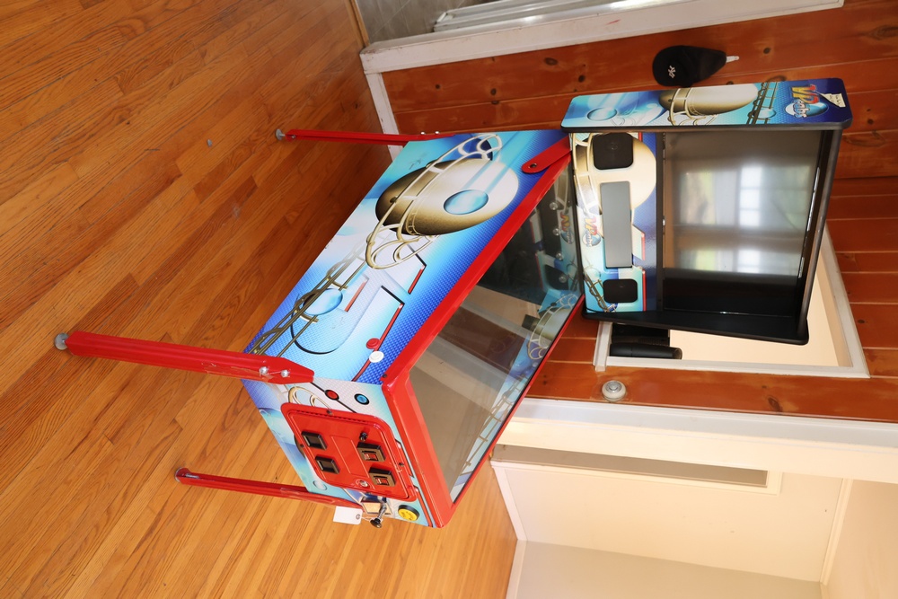 VPcabs digital pinball machine, model LE, serial no. 1162, manufactured in 2015 by VPcabs, Cincinnati, Ohio. The cabinet features custom “JW GFX” artwork, a full digital playfield display, coin door with dual coin slots, and illuminated control buttons including Start, Exit, and Launch Ball. Equipped with the VPcabs Quick Loc head locking system requiring no bolts or glass removal. Unit did not power on when tested and may require repair to operate.