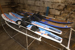 Two pairs of water skis manufactured by Wellington Leisure Products, Inc., Madison, Georgia. The set features one pair of EP “Electra 67” skis and one pair of EP “Wide Track” skis, each with molded rubber foot bindings and composite construction.