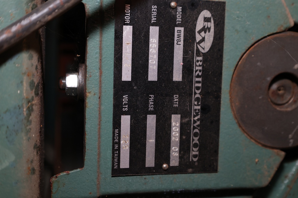Bridgewood model BW8J jointer, single-phase 230V, 1.5HP motor, made in Taiwan. Features an 8" cutting width capacity with precision-ground cast-iron infeed and outfeed tables, adjustable fence with tilt controls, and handwheel height adjustment. Equipped with a cutter head guard, belt-driven motor system, and power switch with safety cover. Designed for jointing and edge-flattening operations in woodworking and furniture fabrication.