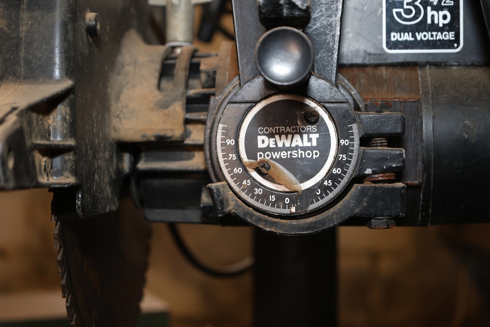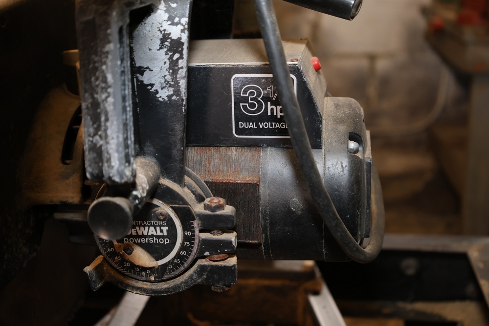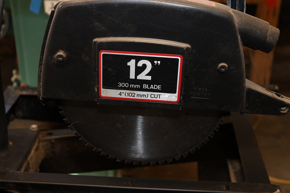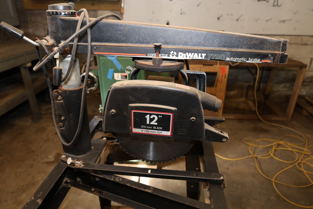 DeWalt model 7790 12" radial arm saw, 3½ HP dual-voltage motor with automatic brake, mounted on a heavy-duty steel stand. Features adjustable arm with bevel and miter capability, 12" (300mm) blade capacity, and cutting depth up to approximately 4" (102mm). Equipped with Contractor’s PowerShop controls, angle gauge, and integrated handle adjustments for precision crosscuts, bevels, and compound miters. Designed for woodworking, framing, and general shop applications.