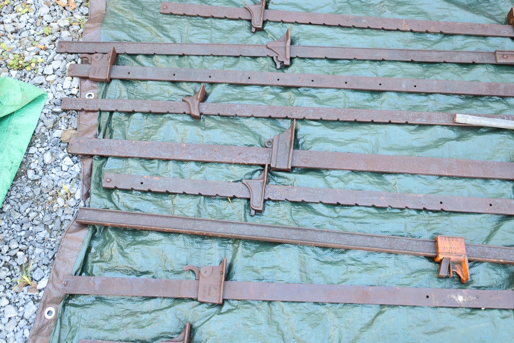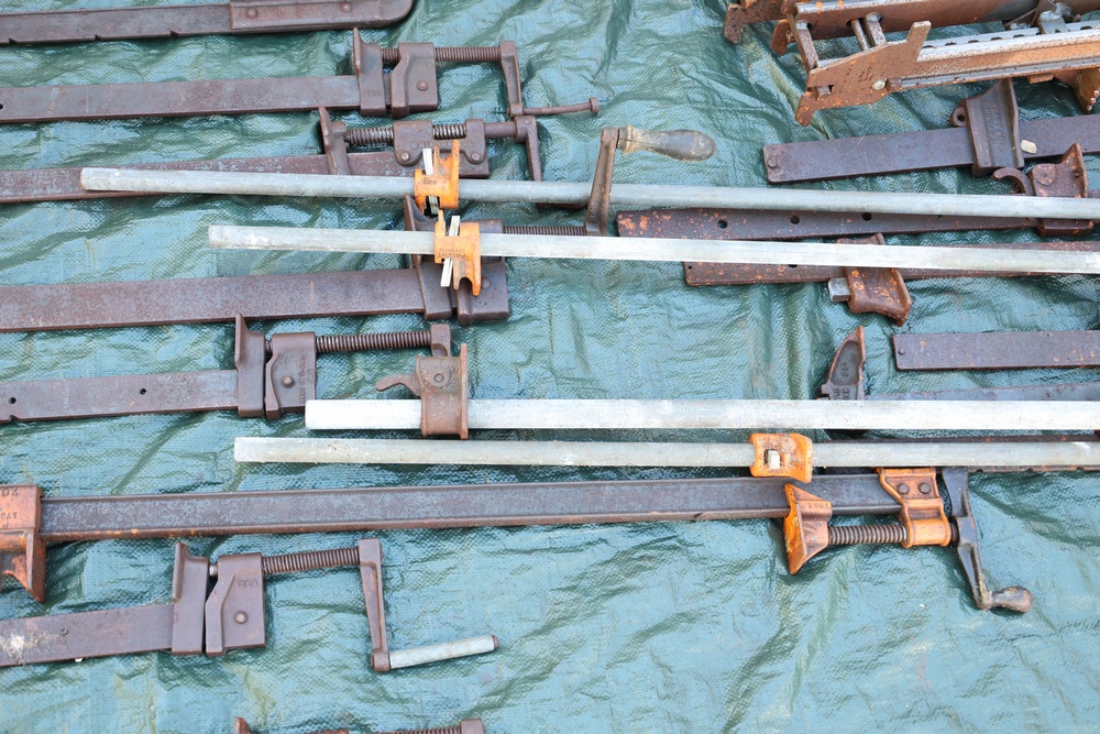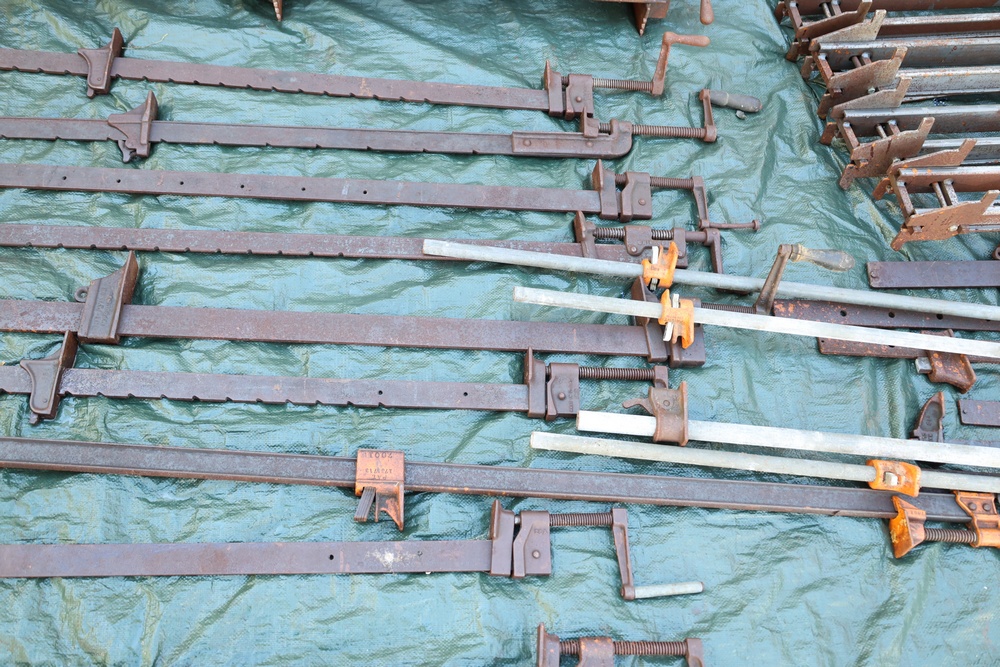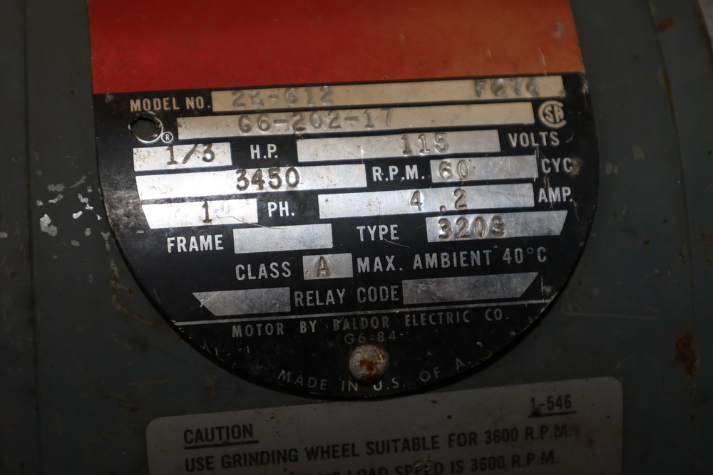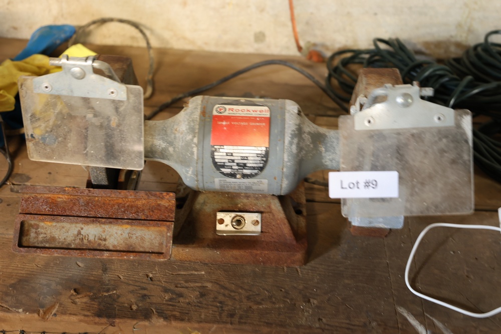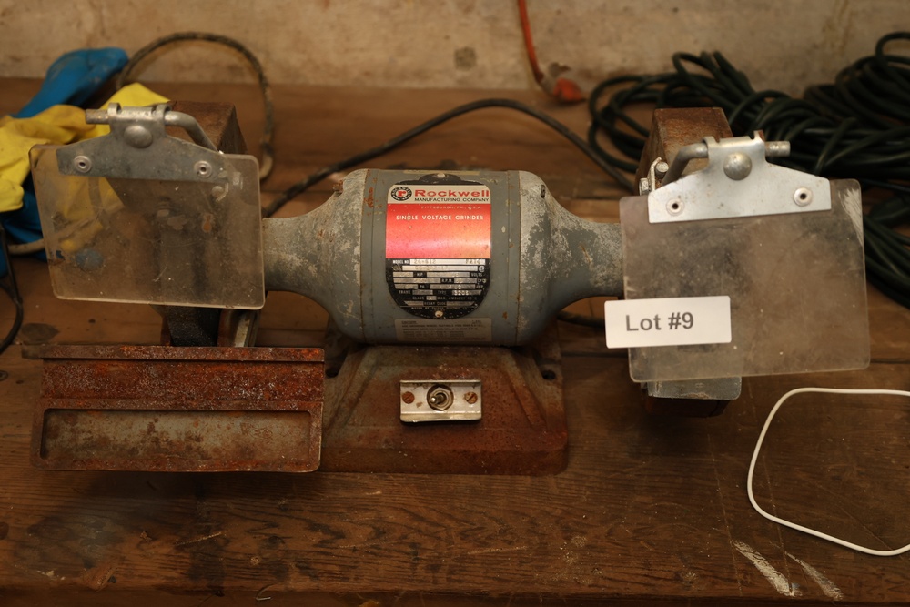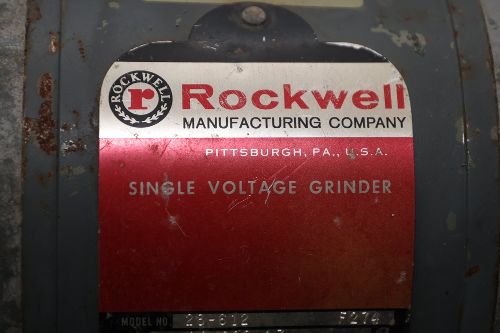 Lot includes a Columbian bench vise and a selection of bar clamps and pipe clamps along with a Rockwell Manufacturing Company bench grinder. The Columbian vise is a cast iron bench vise marked “Columbian Vise 64½.” The assortment of clamps includes various lengths of steel bar and pipe clamps with screw and lever mechanisms. The Rockwell single voltage grinder, model 23-612, is rated at 1/3 HP, 115 volts, 4.2 amps, and 3450 RPM, powered by a Baldor Electric motor, Type 320S. Excludes clamps in lot 7.
