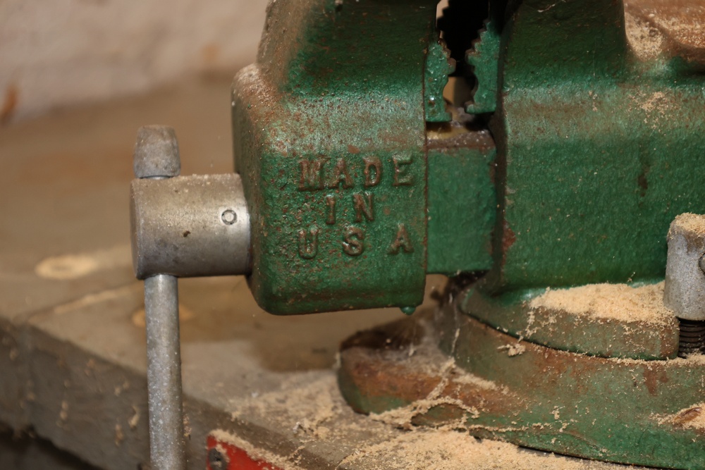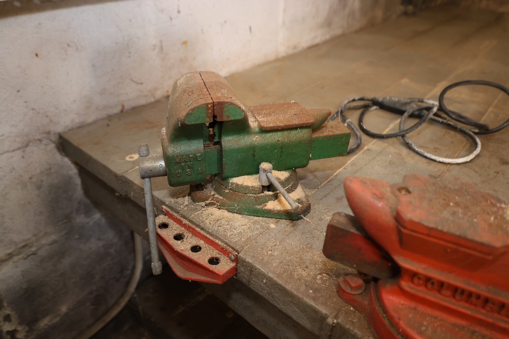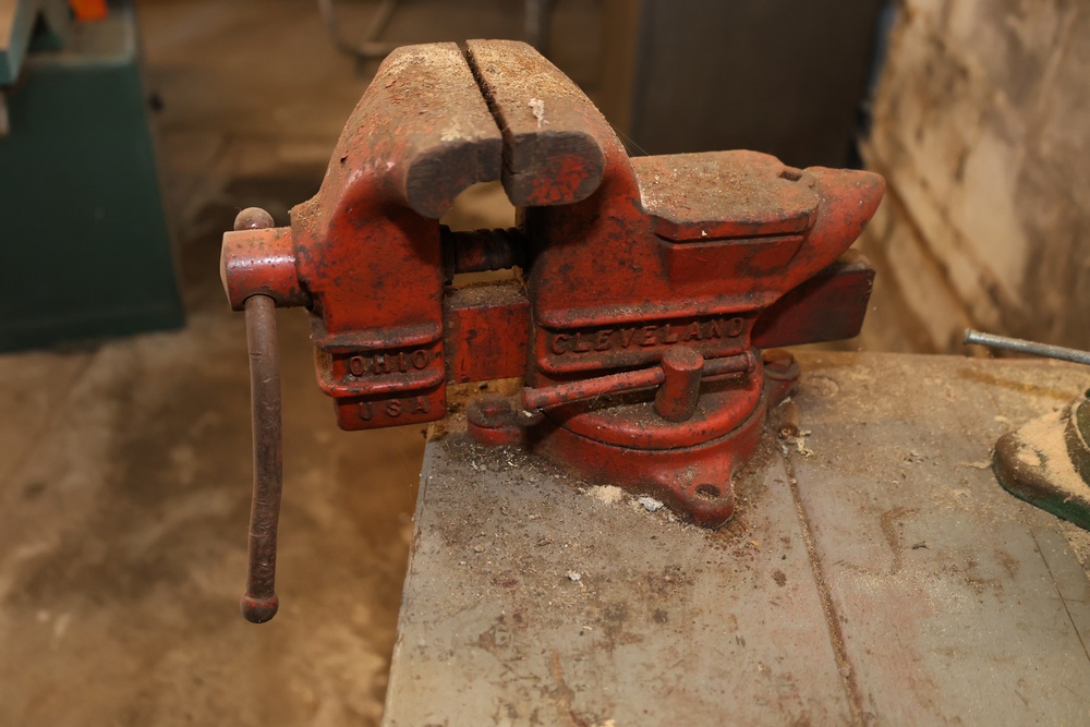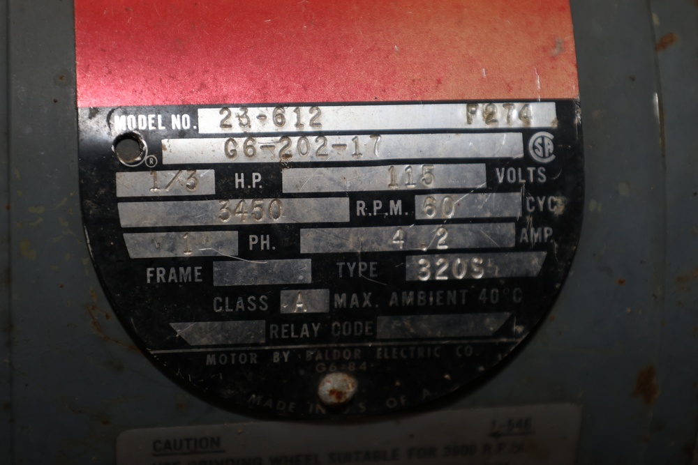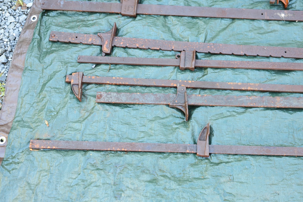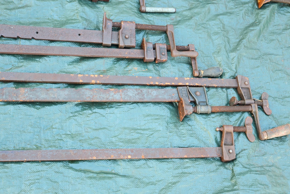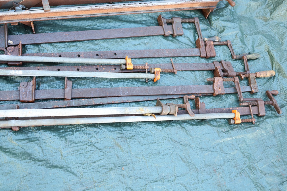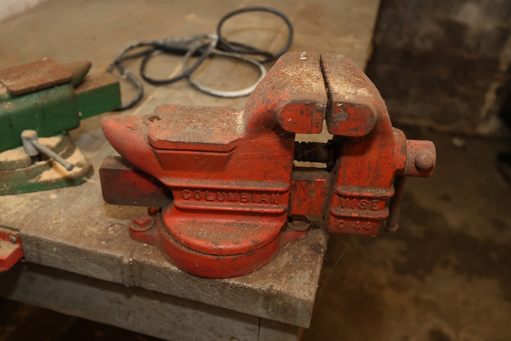 Lot includes a Columbian bench vise and a selection of bar clamps and pipe clamps along with a Rockwell Manufacturing Company bench grinder. The Columbian vise is a cast iron bench vise marked “Columbian Vise 64½.” The assortment of clamps includes various lengths of steel bar and pipe clamps with screw and lever mechanisms. The Rockwell single voltage grinder, model 23-612, is rated at 1/3 HP, 115 volts, 4.2 amps, and 3450 RPM, powered by a Baldor Electric motor, Type 320S. Excludes clamps in lot 7.