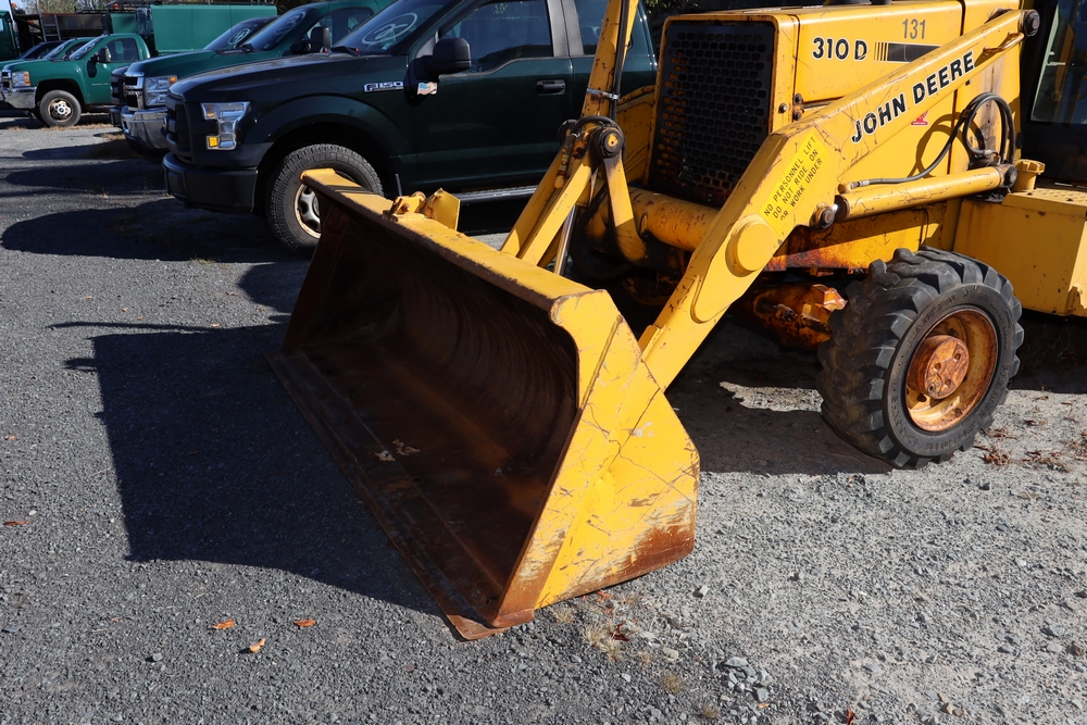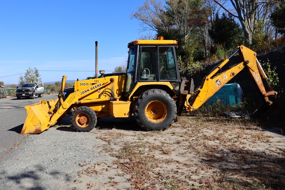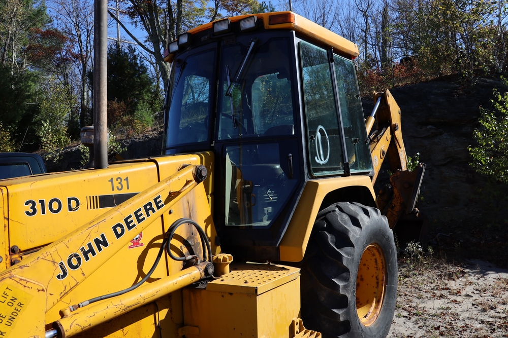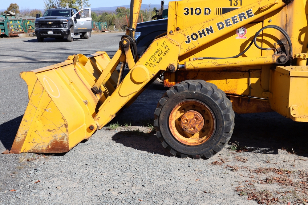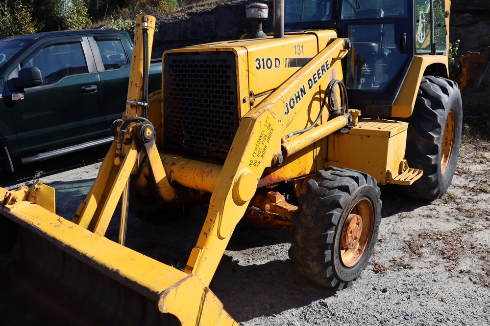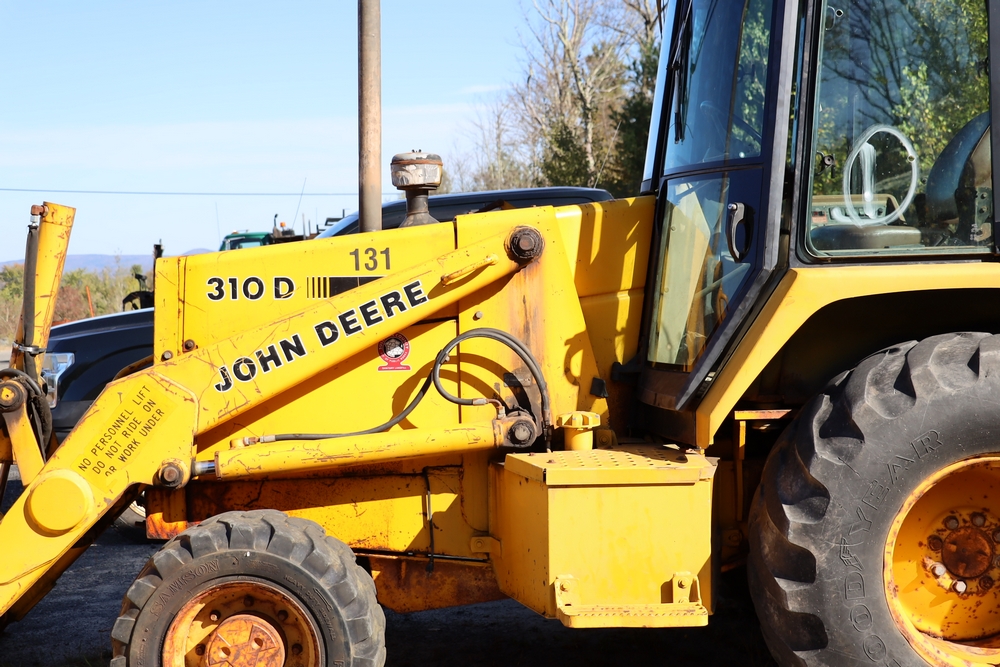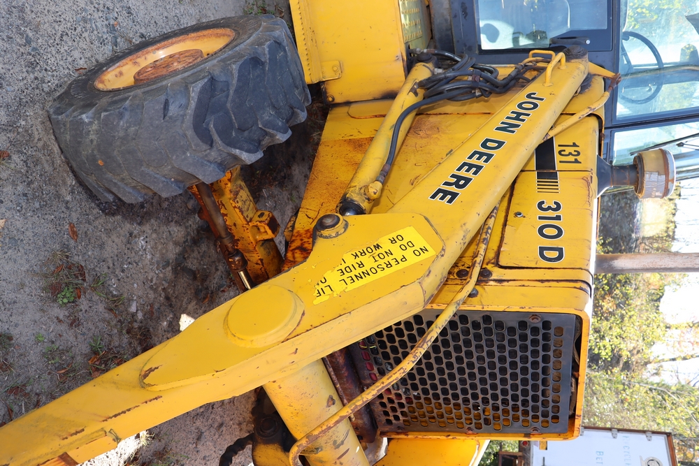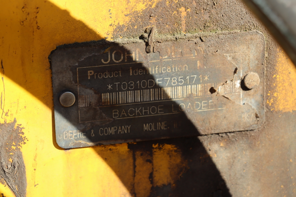 1992 John Deere 310D 4WD Backhoe. Weight 14,900 lbs, Motor: 403 9D 4Cyl diesel 70HP Front tire 12-26.5 Rear tire 19.5L-24, 2 Stick Backhoe. The Hydraulic cooler was bypassed with a hose due to a leak. Machine is older but operates as it should. Hours 9,961. VIN: T0310DF85171 No Asset Tag