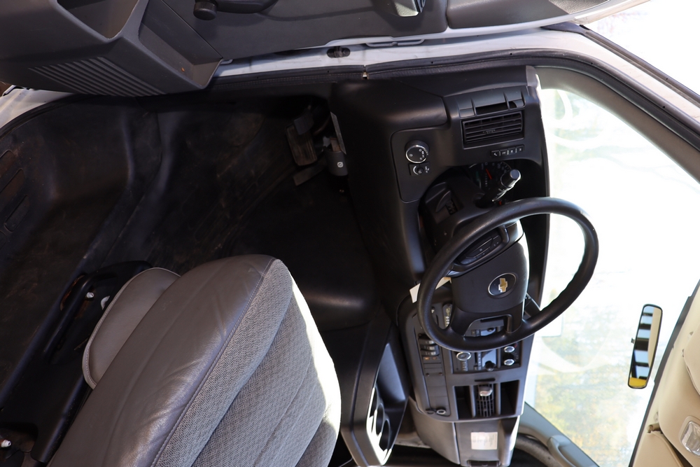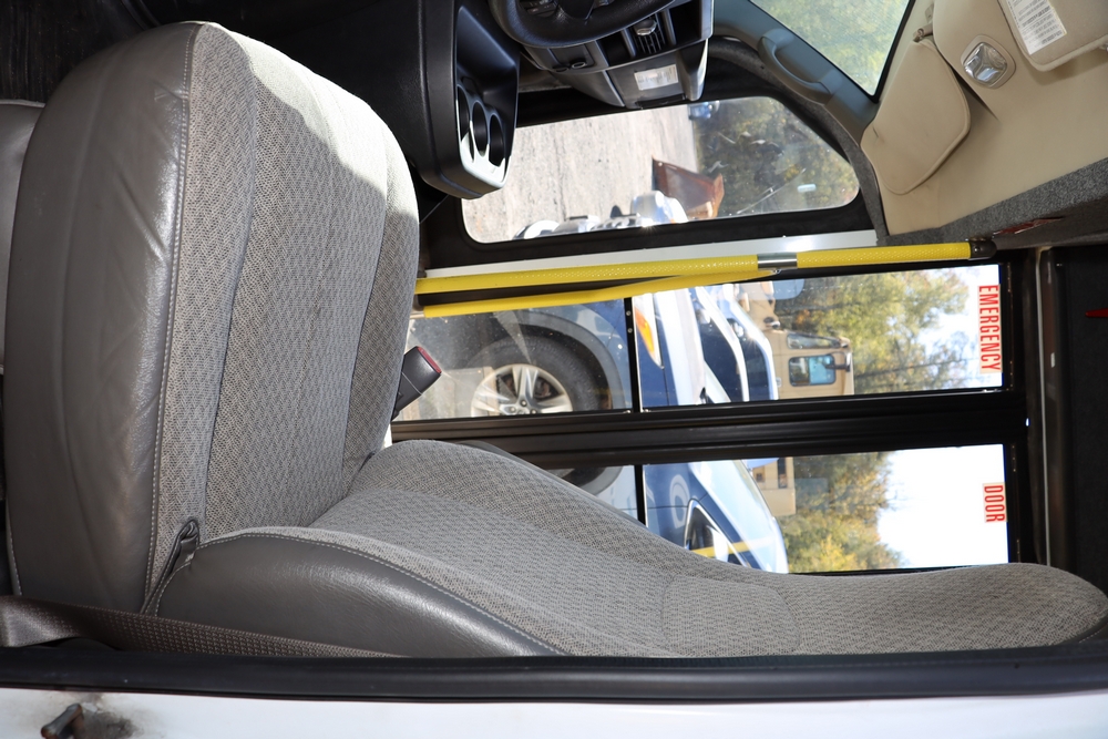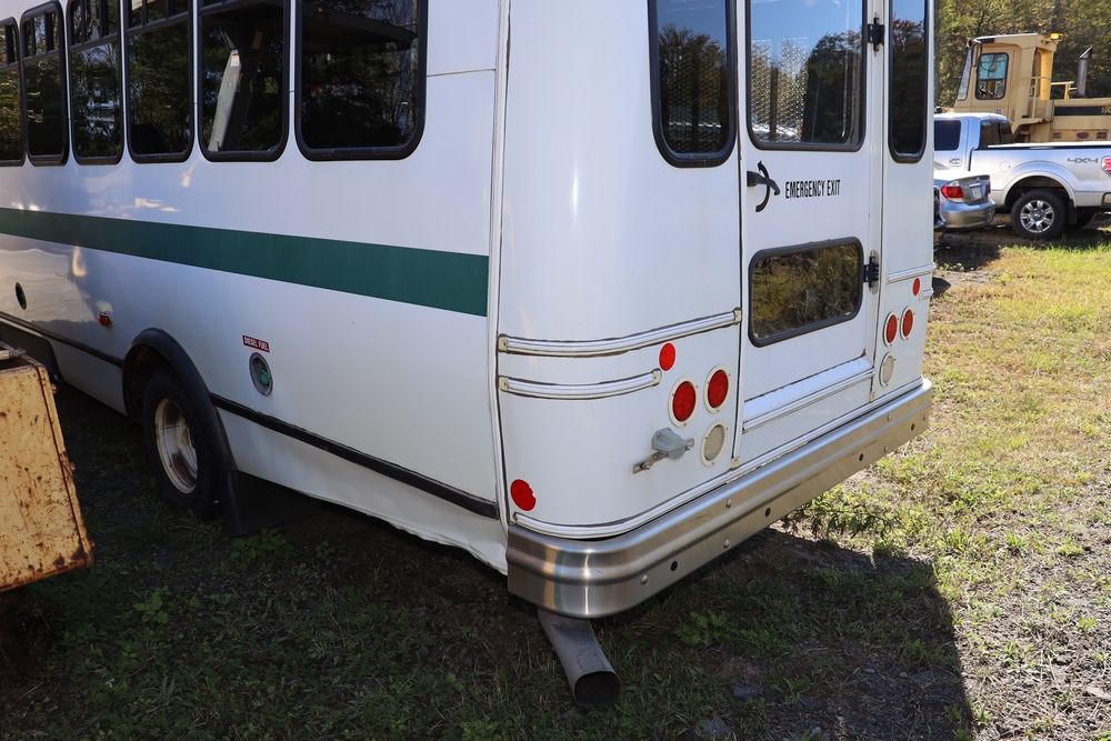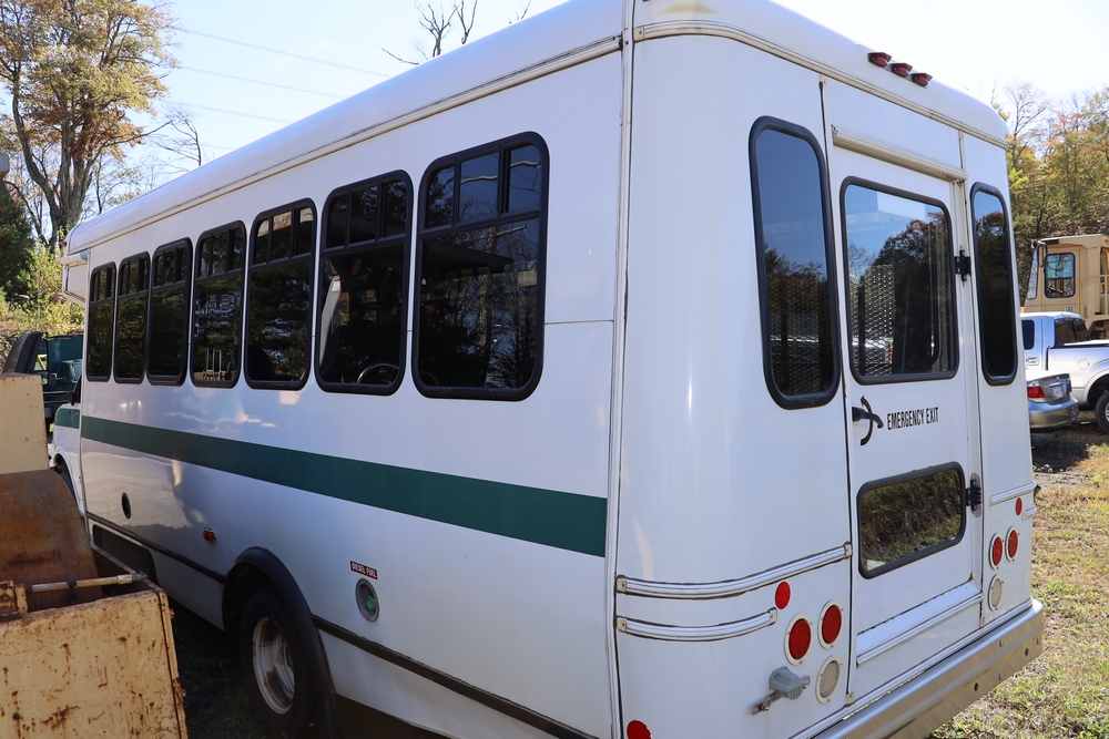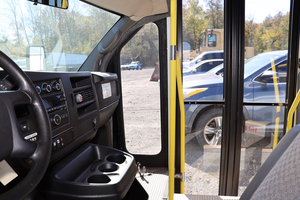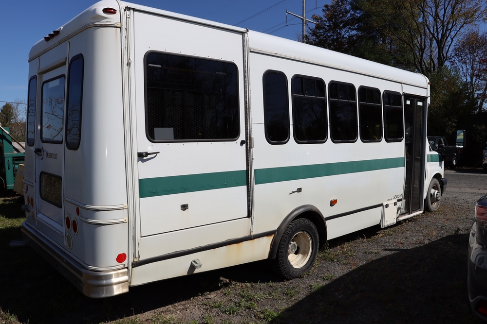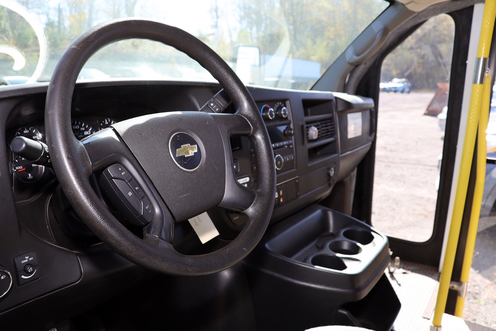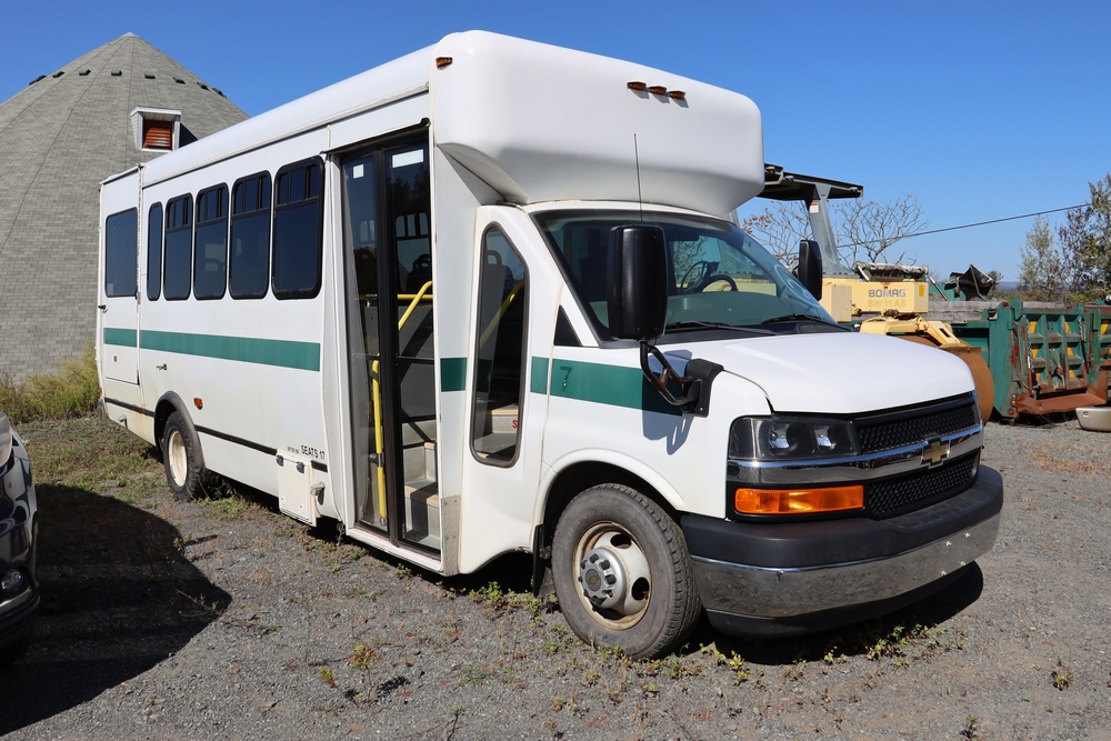 2014 Chevrolet Express 4500 14 Passenger Bus with wheel chair lift. Engine: 6.6L Duramax V8 diesel. Transmission 6 speed Auto OD. Tires: 225/75R16. Braun Century 2 Lift 800lbs capacity. Bus Starts and moves, Right passenger door won’t open. Right rear axle seal is leaking. 146,805. Miles VIN: 1GB6G6BL9E1173148. Asset Tag 41256.