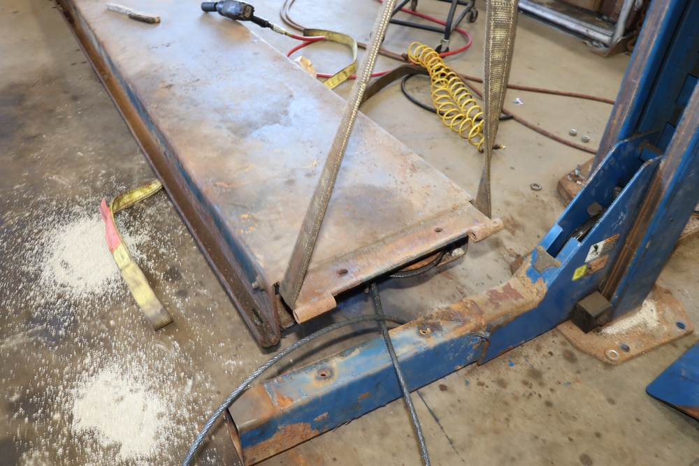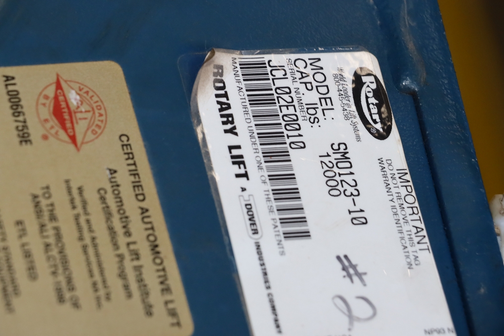 Used Rotary 4 post drive on lift. Model SM0123-10, 12,000lbs capacity. Lift has been taken apart and stored for auction. Comes with two sliding bridges. Older lift has some minor issues. S/N: JCL02E0010. Asset Tag 19373.