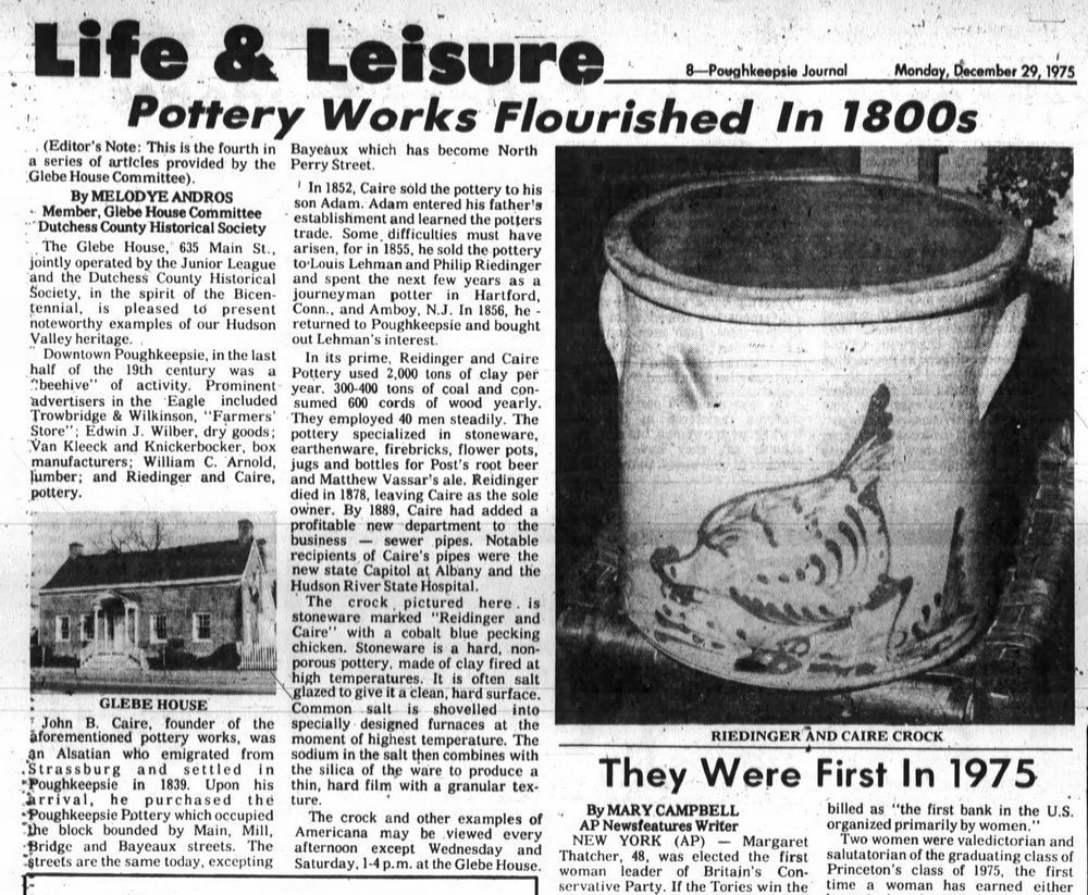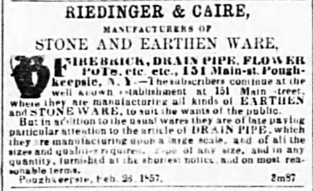This year's example made by Adam Caire is the earliest donated so far, made between 1852 and 1856. Riedinger & Caire Pottery was first developed by John Caire when he bought Poughkeepsie Pottery in 1839. Adam Caire entered his father's business in 1852. After selling the business and then buying it back in 1856, Caire became a partner to Philip Riedinger. The company manufactured stoneware, earthenware, firebricks, flower pots, jugs and bottles. One popular customer included Matthew Vassar's brewery! The partners later developed sewer pipes which were used at the Capitol in Albany and at the Hudson River State Hospital in Poughkeepsie.