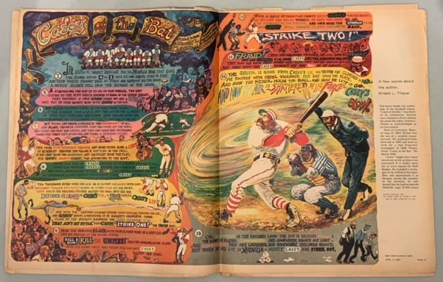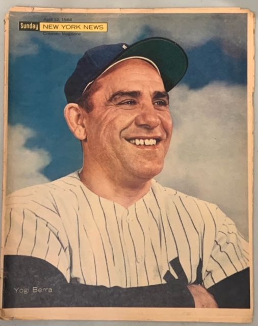 The perfect gift for your favorite NY Yankees fan! Two rare colorful, illustrated New York Yankee ephemera collectibles. The 1966 Yankees Yearbook is complete and in excellent condition. It has 48 black & white illustrated pages plus cover. This Official Program is chock full of photos, stats, profiles and articles. Every player is featured. Measures 8.5"x11". The April 12, 1964 color portrait of NY Yankee Yogi Berra is on the cover of the Sunday New York News. The large, 13.5"x11", twenty-seven page insert is full of articles, photos and vintage ads. It is in very good condition for its age. Back cover is a full color advertisement for Scott paper products.