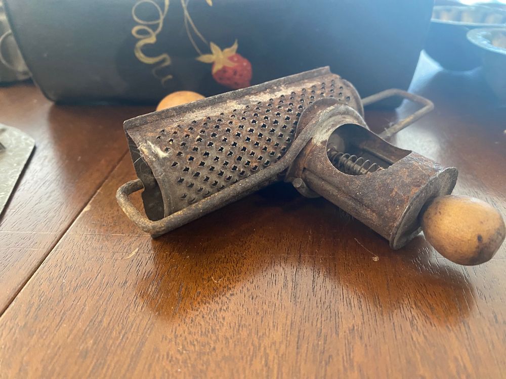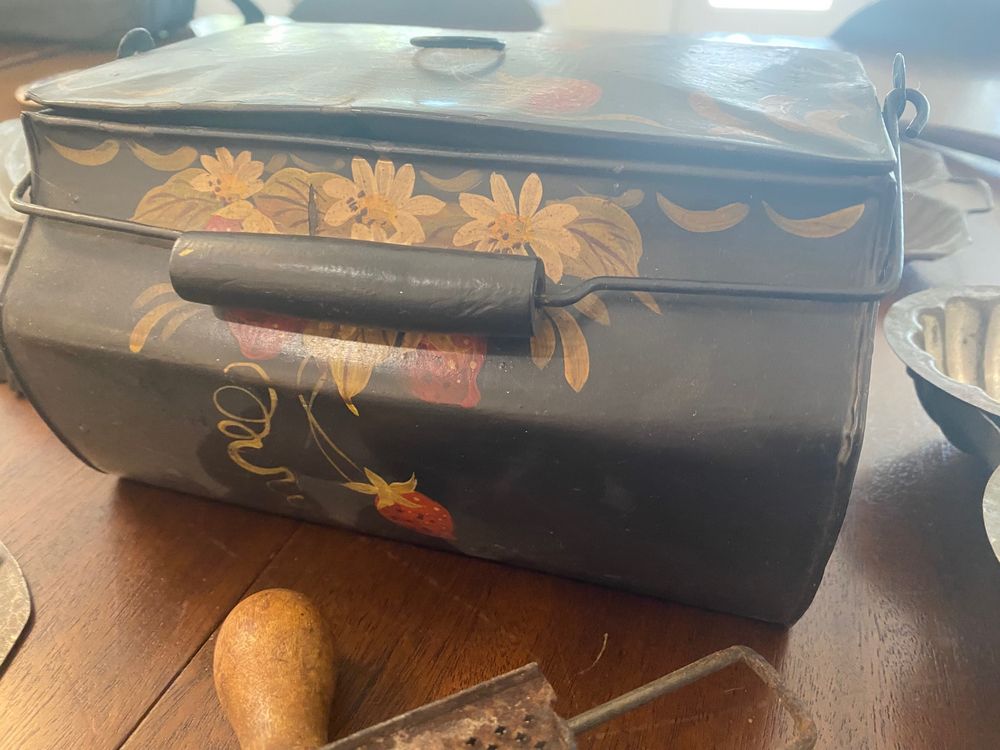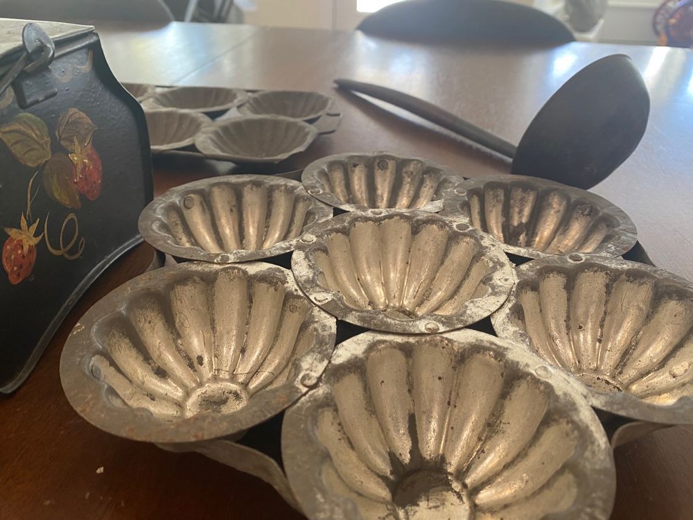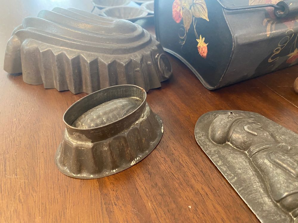 This assortment of Victorian kitchen antiques is perfect for a country cottage look and could still be used with some cleaning. The lot consists of the following: Toleware box with wire handle in excellent condition; two sets of shallow cookie/biscuit molds; four bread or pastry molds, including man on motorcycle, corn motif, and rabbits; adjustable nutmeg grater; pewter ladle with wood handle. VALUE $250