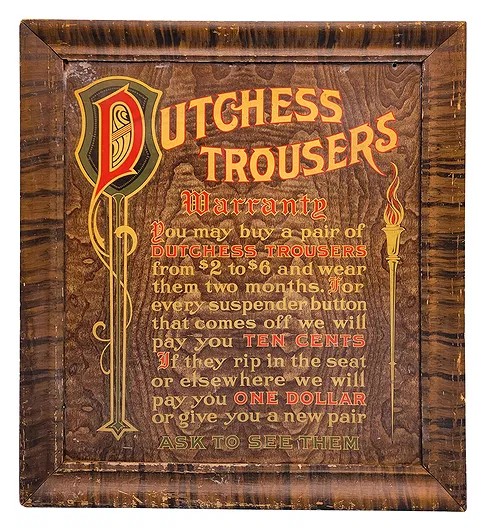 Rare Tin Advertising Sign for Dutchess Trousers, Pickup Only, Rhinebeck, NY