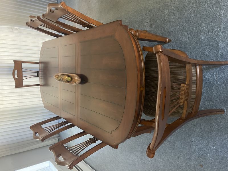 Formal Dining Set. Beveled oblong dining table with panel inlay & carved legs (poss cherry finish), approx. 86"Lx40"Wx29.5, one table insert, 18"W; set/6 matching spindle back chairs with upholstered striped seats (two arm, four side, ea. approx. 22.5"Wx18"Dx42"H. See photo for details. Loc up one flight in raised ranch.