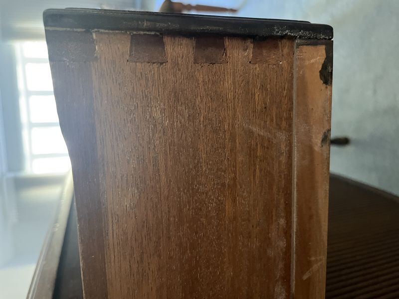 Sideboard Buffet, Wall Mirror. Hardwood buffet with single dovetailed drawer, felt lined with wood dividers & two cabinet doors (brass HW), 65.5"Wx21"Dx37"H; coordinating wood framed wall mirror. Matches hutch in Lot #4. Loc up one flight in raised ranch.