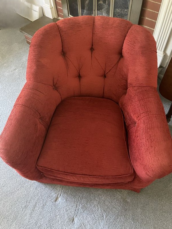 Swivel Chair, Drop Leaf Table. Jessica Charles fully upholstered vintage swivel barrel chair, 31"Wx21"Dx30"H; hardwood drop leaf table, opens to 44"Wx45"Dx29"H. Loc up one flight in raised ranch.