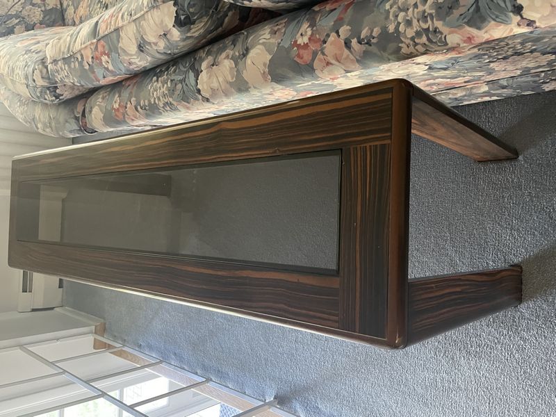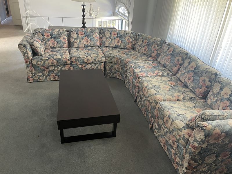 Sectional Sofa, Tables, Lamp. Reid Interiors US made 4-pc fully upholstered skirted sectional sofa, 95"Wx105"Lx35"H; open shelf coffee table, 4'Wx25"Dx16"H; sofa table with glass insert, 5'Wx16"Dx35"H; table lamp 32"H. See photos arm damage and other details. Loc up one flight in raised ranch.
