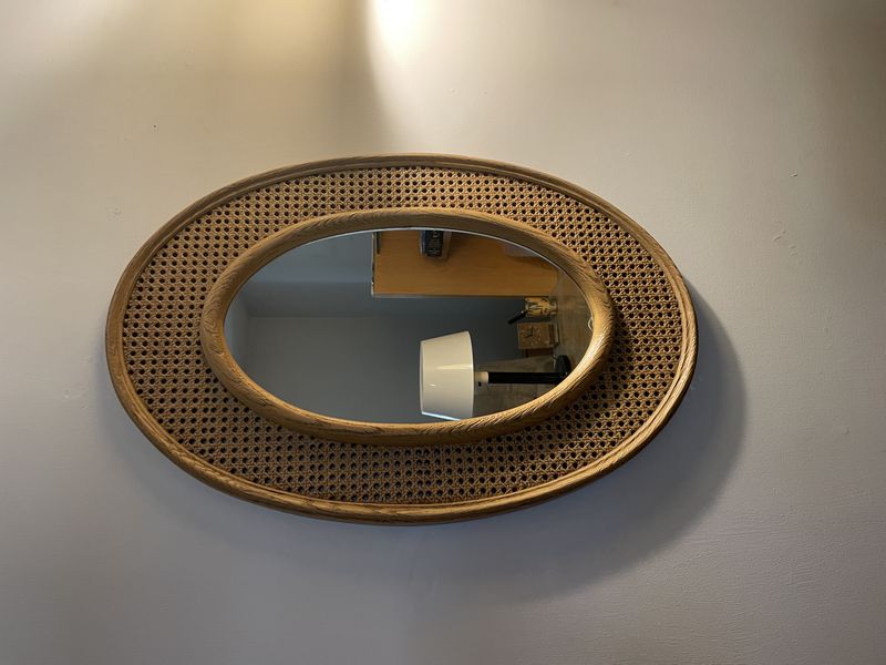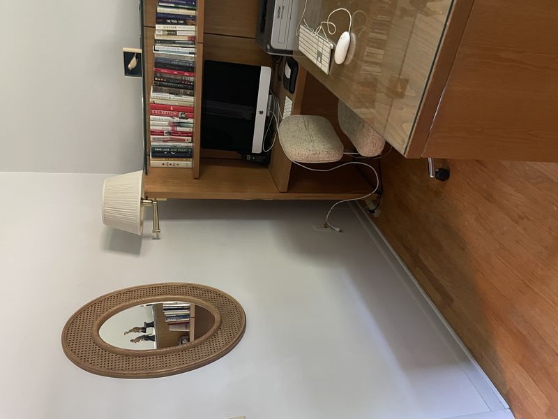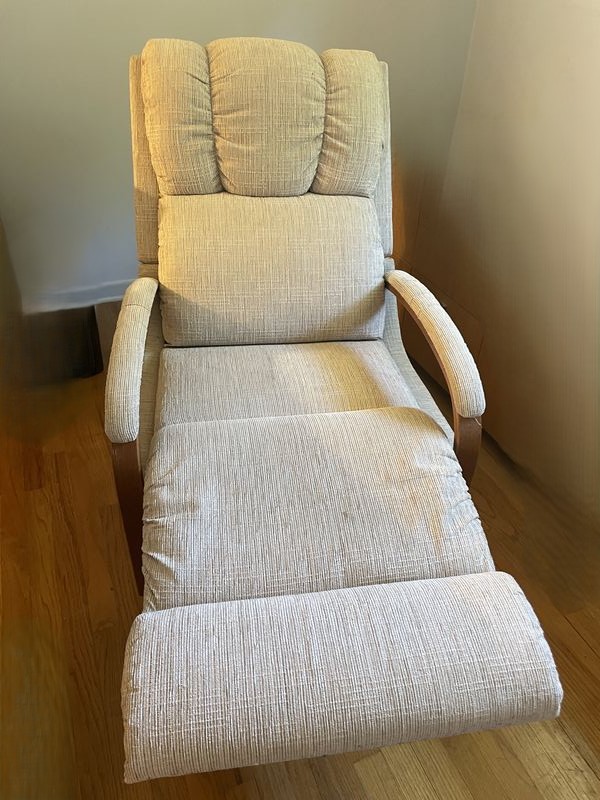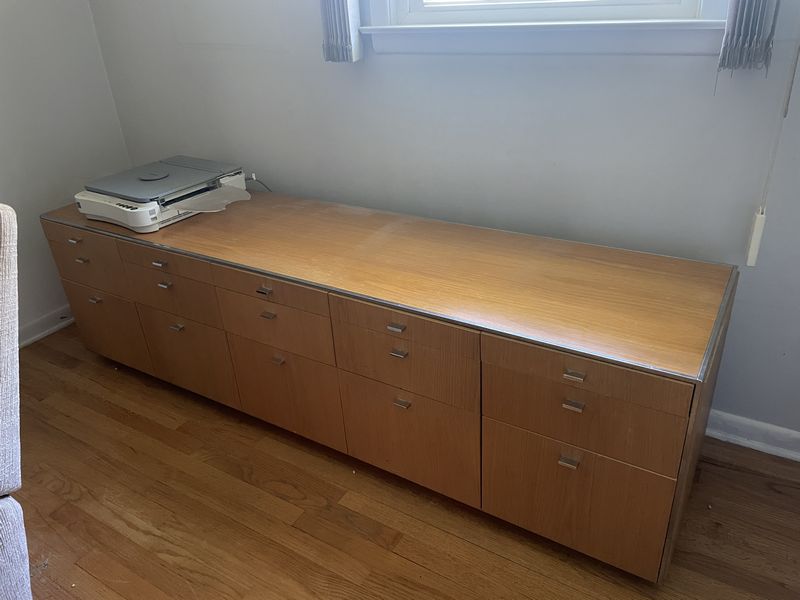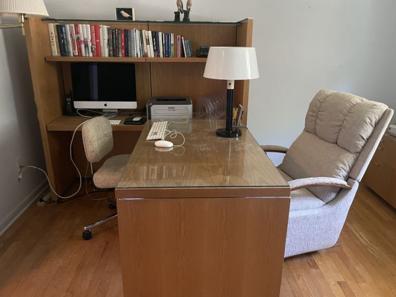 Office Furniture, Books, Decor. Contemporary-style office desk with pencil drawer & file drawer plus protective glass, 63"Wx20"Dx59"H, attach return with bookcase hutch top; coordinating 15-drw office credenza with 3" top drawers, 6" middle drawers, 11.5" lower drawers, 63"Wx20"Dx 23"H; upholstered cream-colored recliner, 28"Wx20"Dx38"H (fully to 57"); oval rattan wall mirror, 20"Wx30"L; desk chair; lamp, 23"H; all contents seen in photos. Loc up one flight in raised ranch.