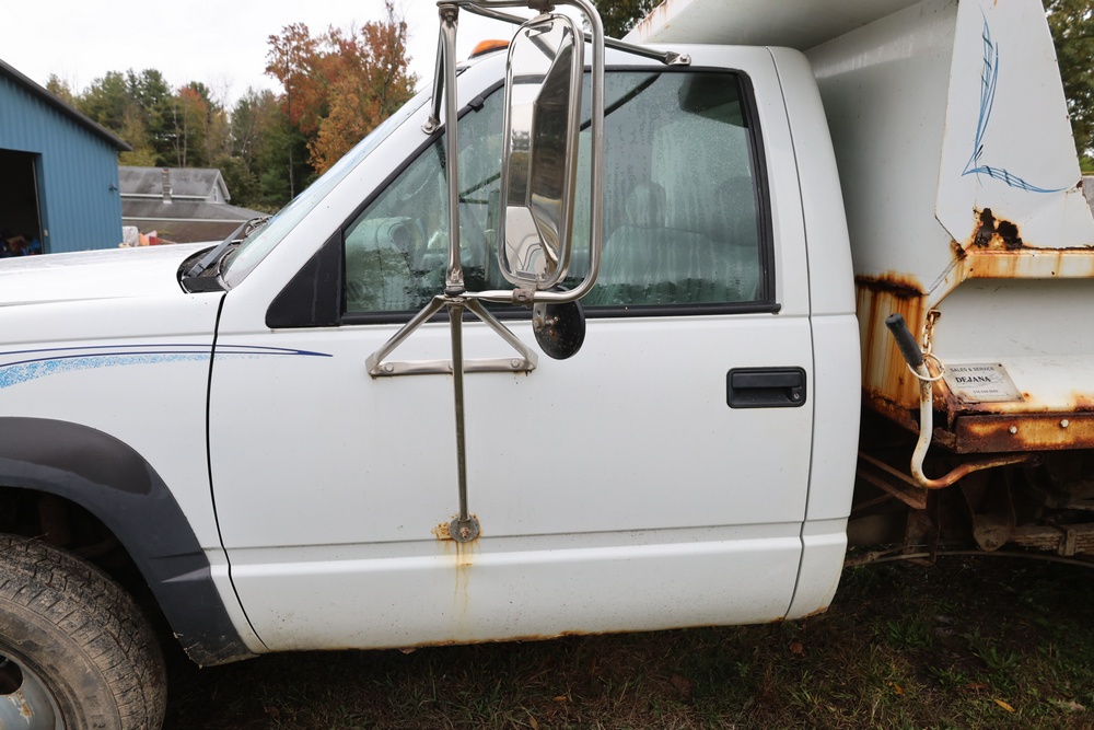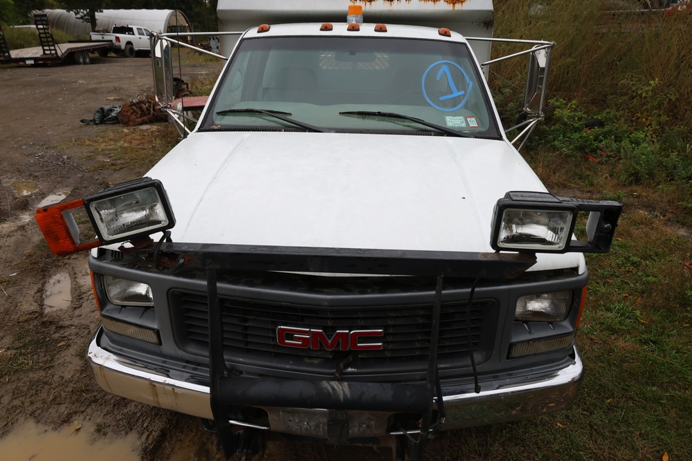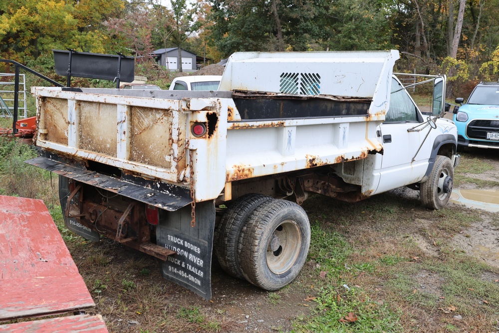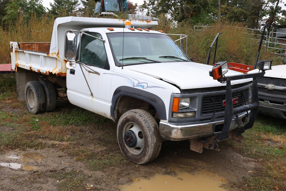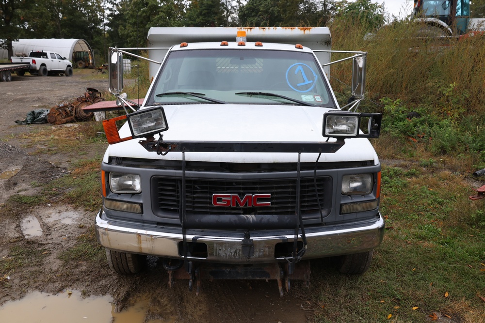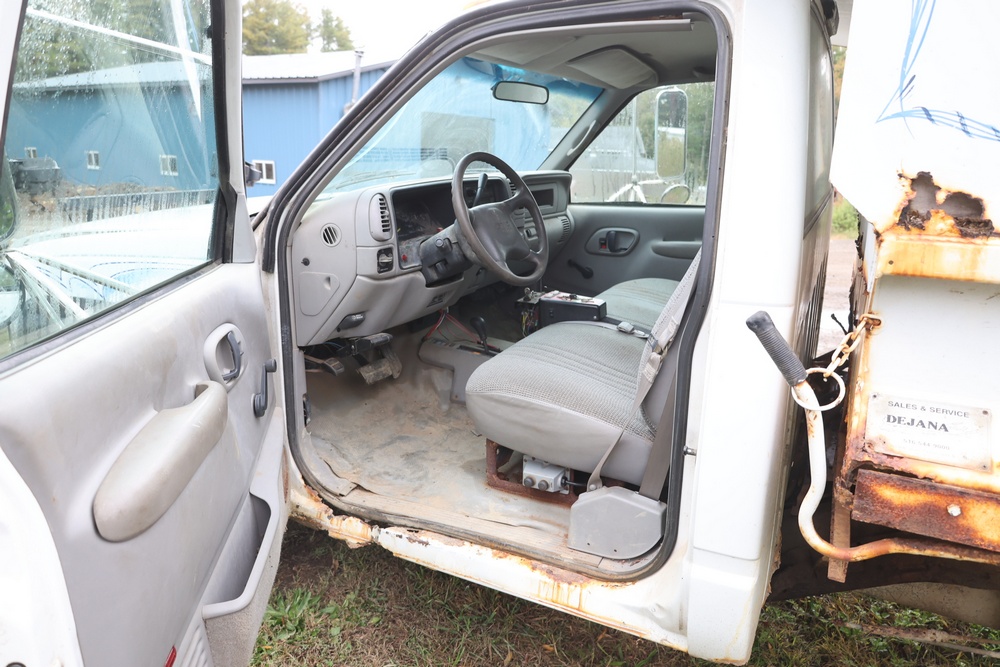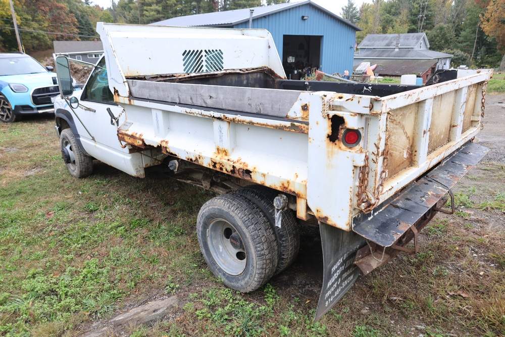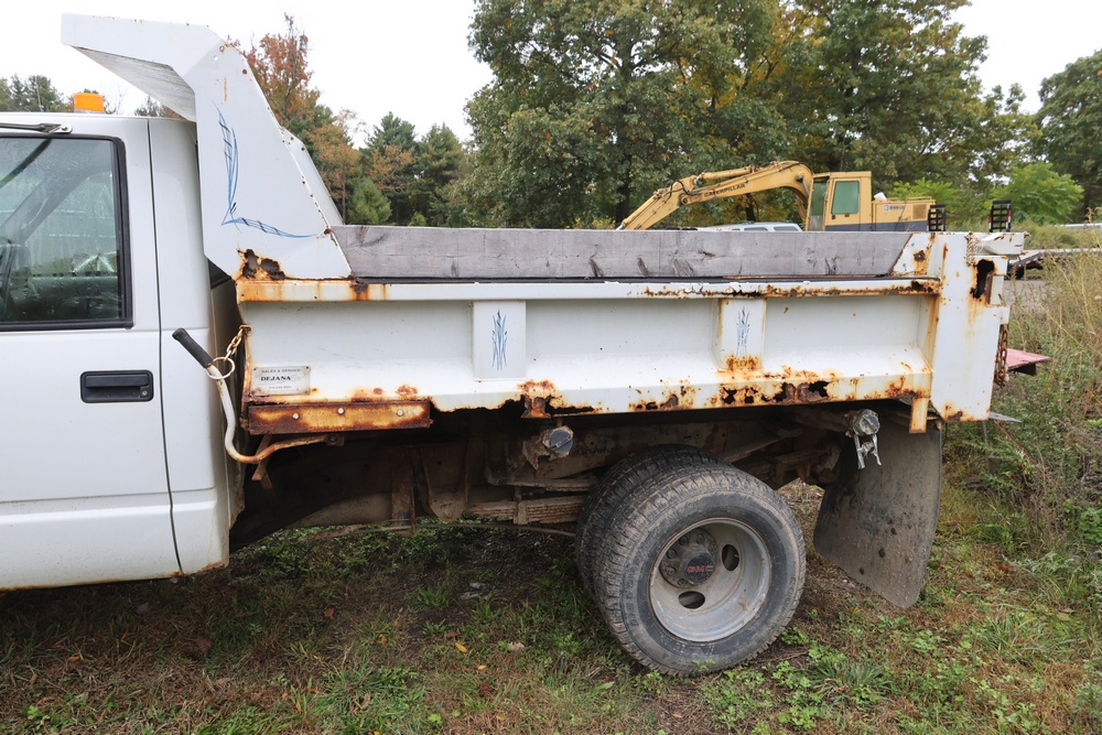 2000 GMC dump truck with a 6.5L V8 OHV 16V TURBO DIESEL engine, automatic transmission, and 4WD. VIN: 1GDJK34F9YF431472. Odometer reading: 21,396. Exterior: White cab with Dejana dump body. Interior: Bench seat, manual windows, auxiliary control box mounted in the center for plow/sander control (plow and sander not included). Tire configuration: Dual rear wheels. Additional equipment includes a dump bed and front plow light brackets. Runs and drives. Title and key available.