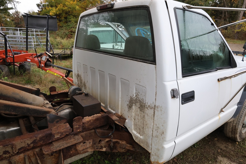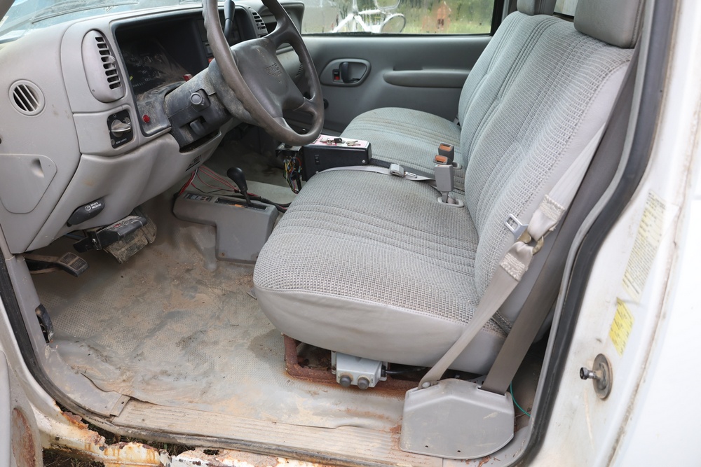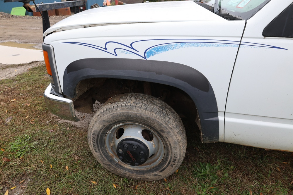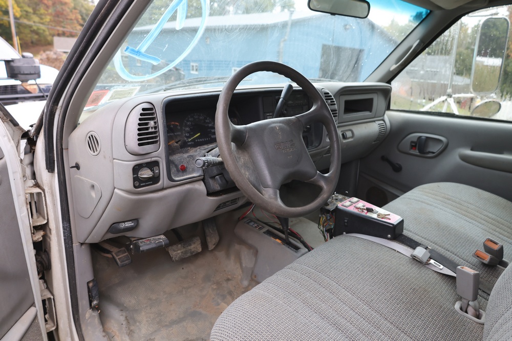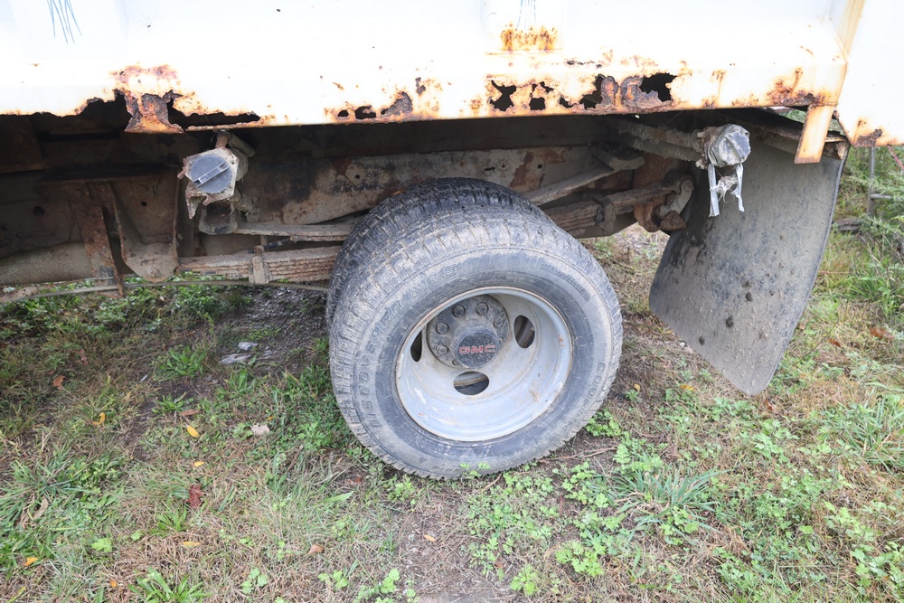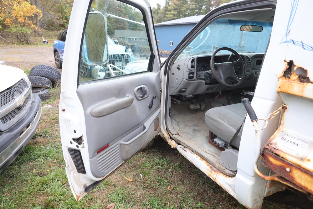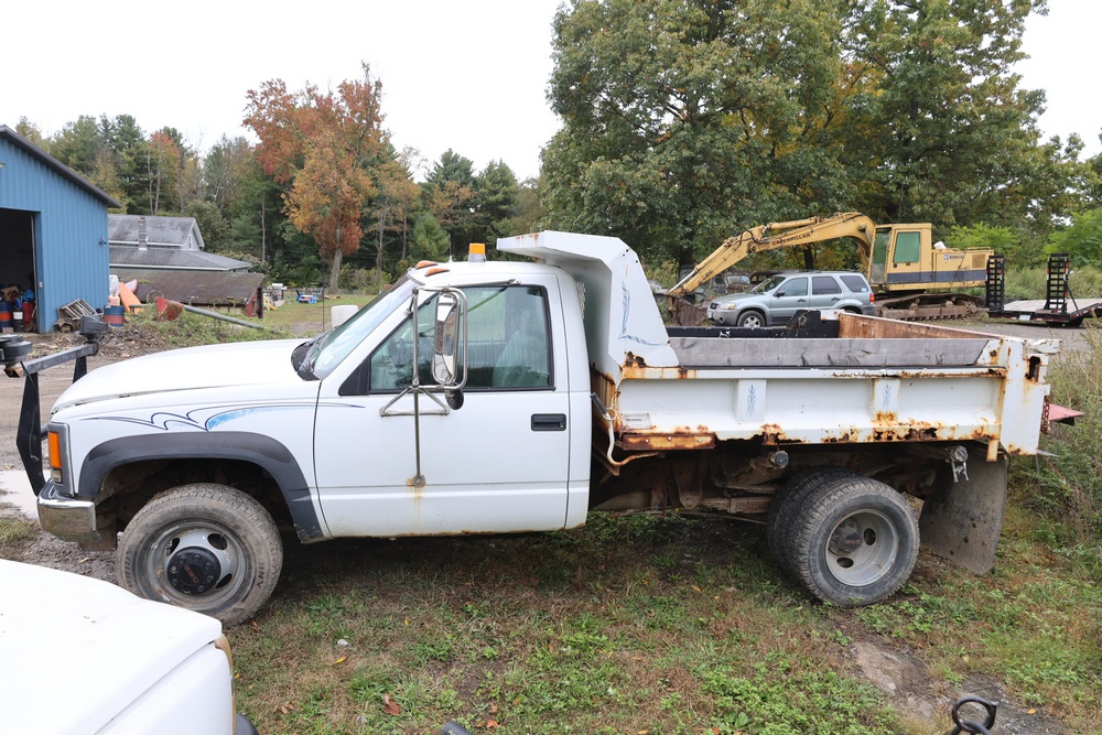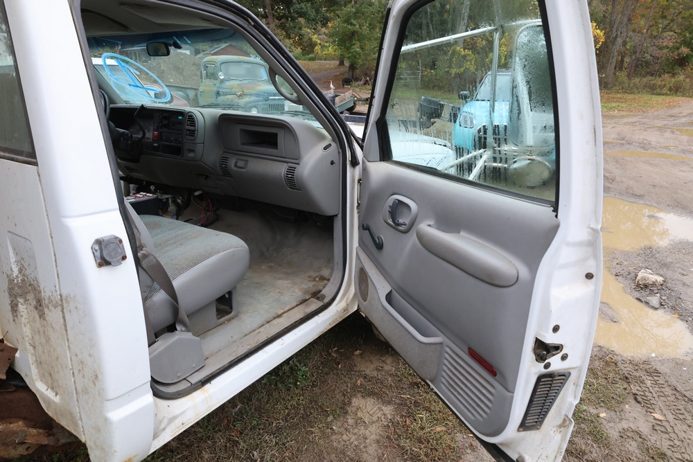 2000 GMC dump truck with a 6.5L V8 OHV 16V TURBO DIESEL engine, automatic transmission, and 4WD. VIN: 1GDJK34F9YF431472. Odometer reading: 21,396. Exterior: White cab with Dejana dump body. Interior: Bench seat, manual windows, auxiliary control box mounted in the center for plow/sander control (plow and sander not included). Tire configuration: Dual rear wheels. Additional equipment includes a dump bed and front plow light brackets. Runs and drives. Title and key available.