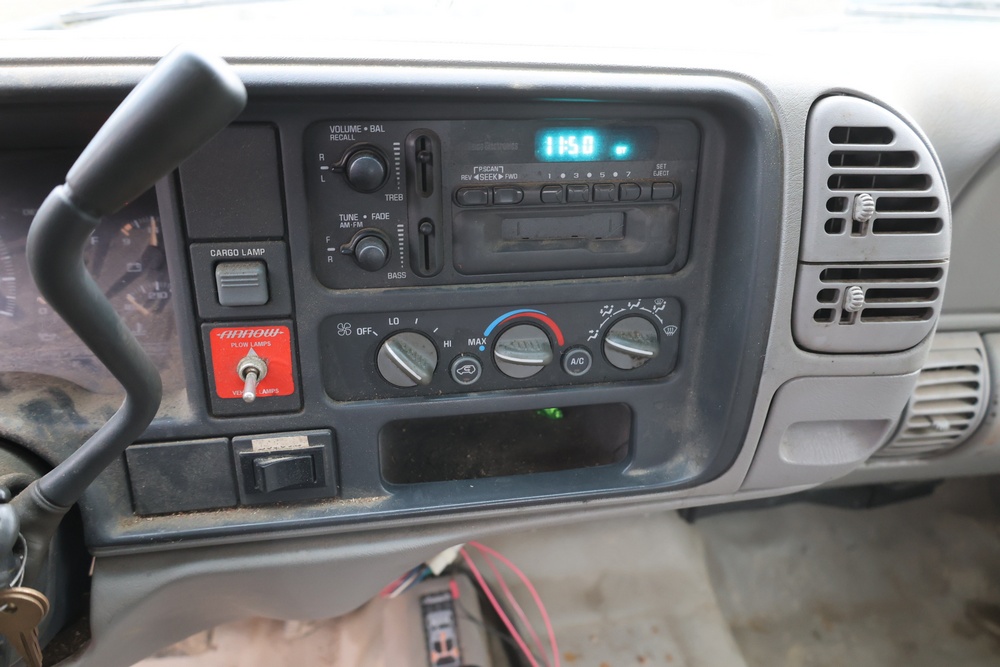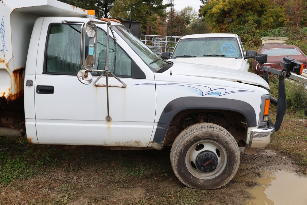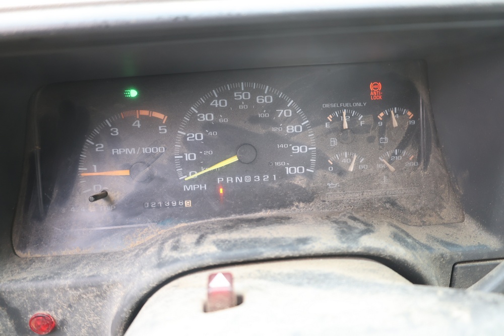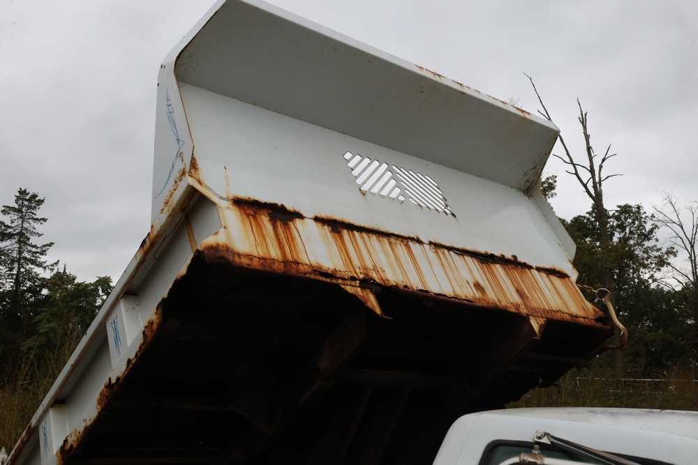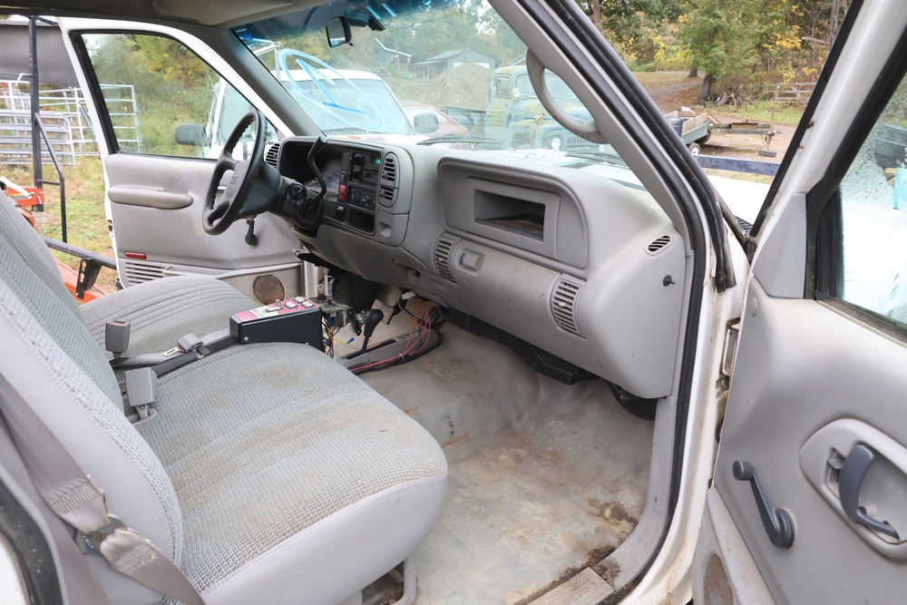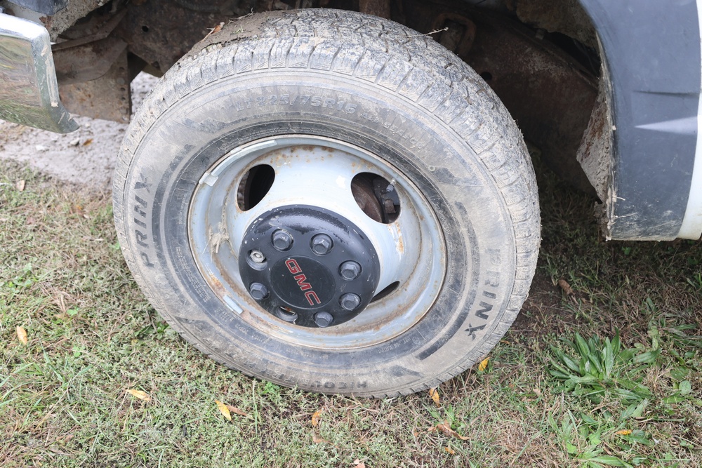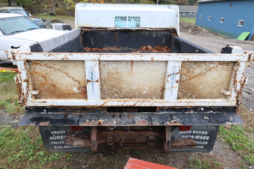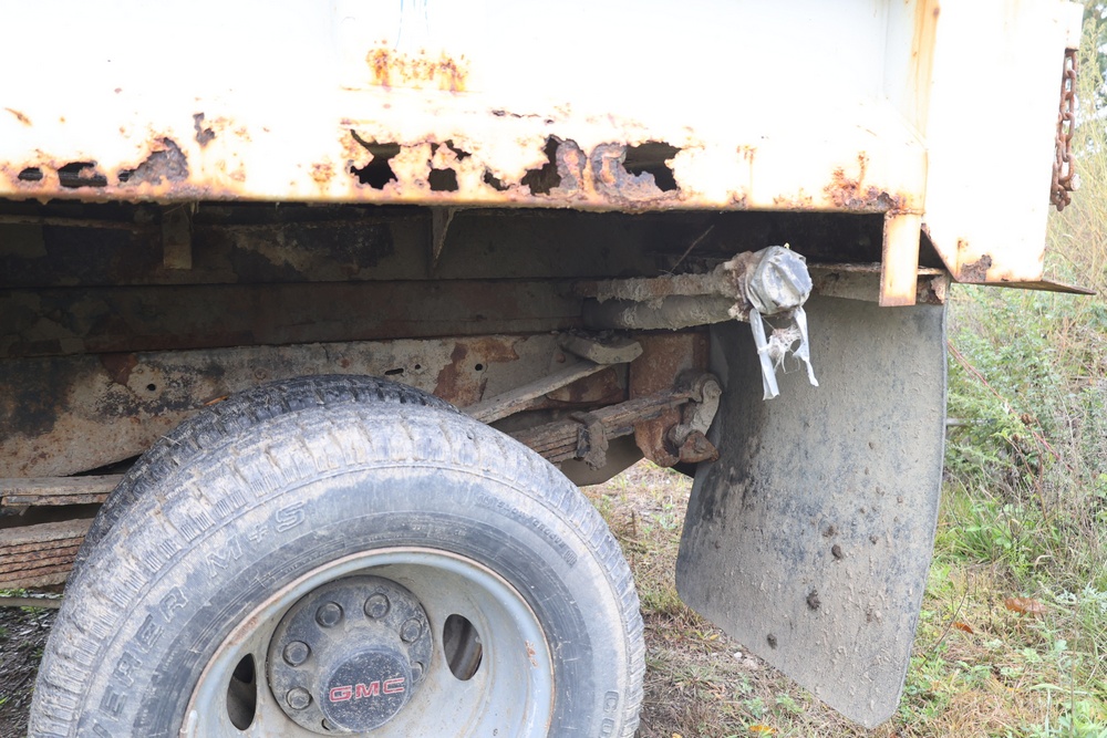 2000 GMC dump truck with a 6.5L V8 OHV 16V TURBO DIESEL engine, automatic transmission, and 4WD. VIN: 1GDJK34F9YF431472. Odometer reading: 21,396. Exterior: White cab with Dejana dump body. Interior: Bench seat, manual windows, auxiliary control box mounted in the center for plow/sander control (plow and sander not included). Tire configuration: Dual rear wheels. Additional equipment includes a dump bed and front plow light brackets. Runs and drives. Title and key available.