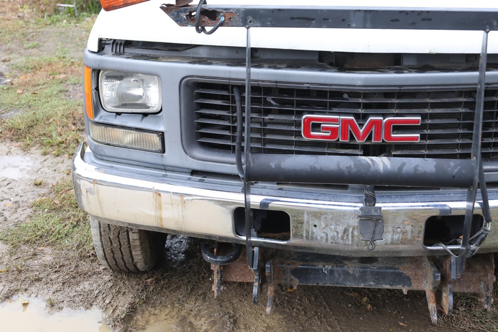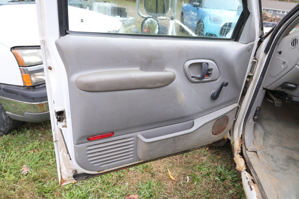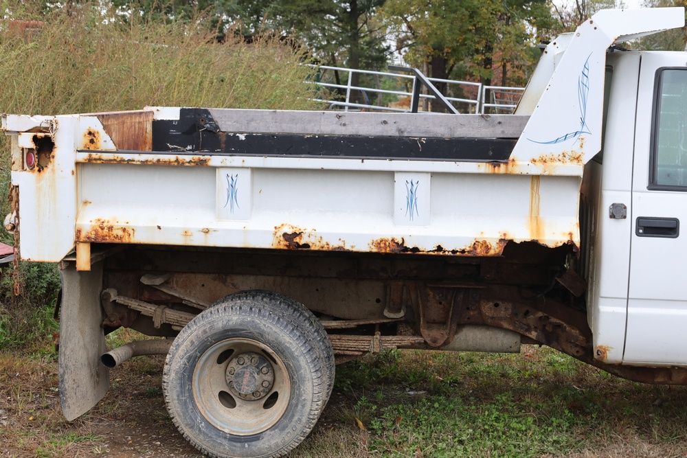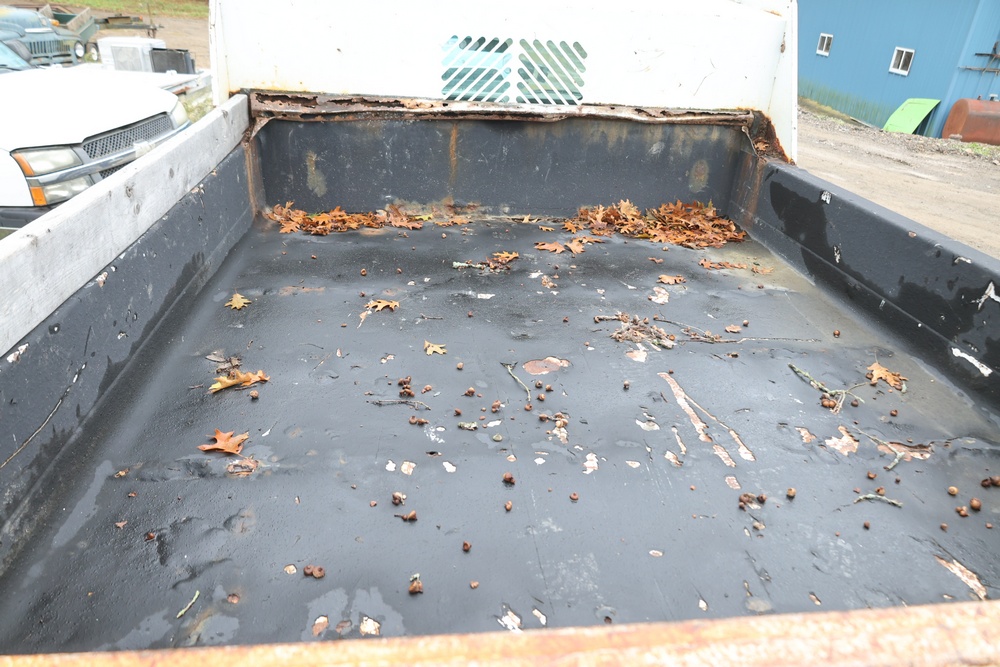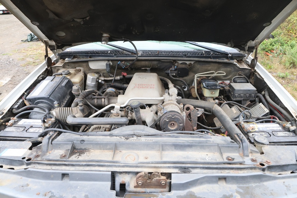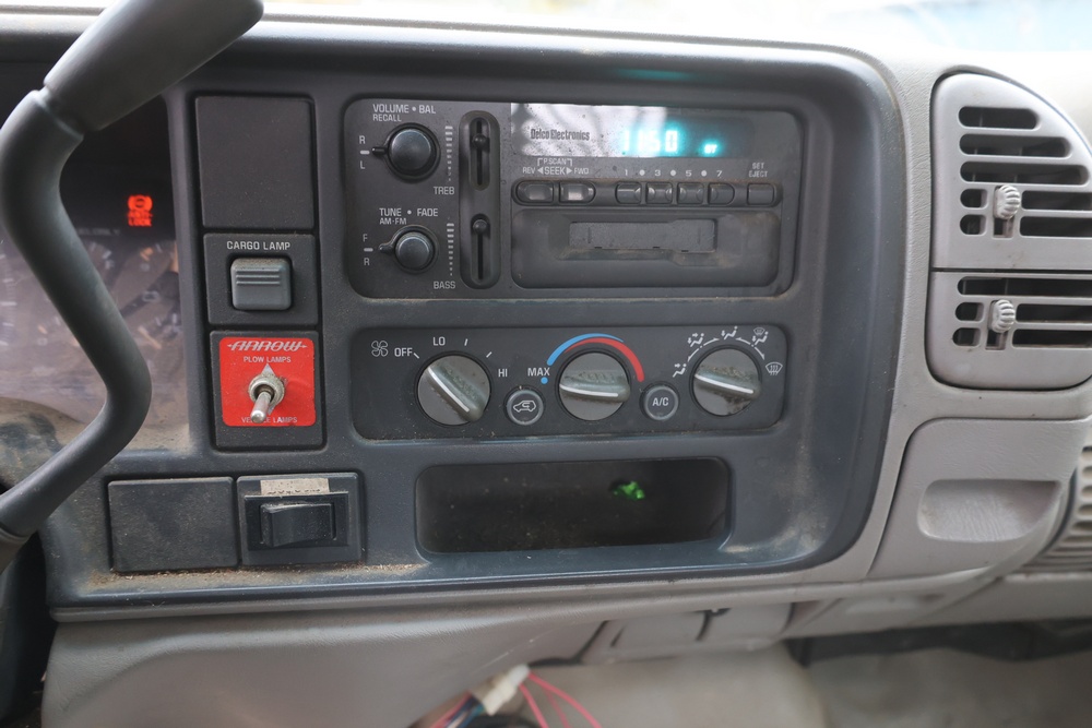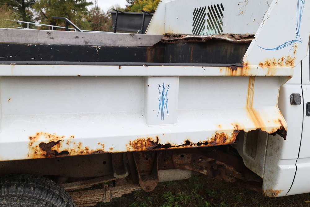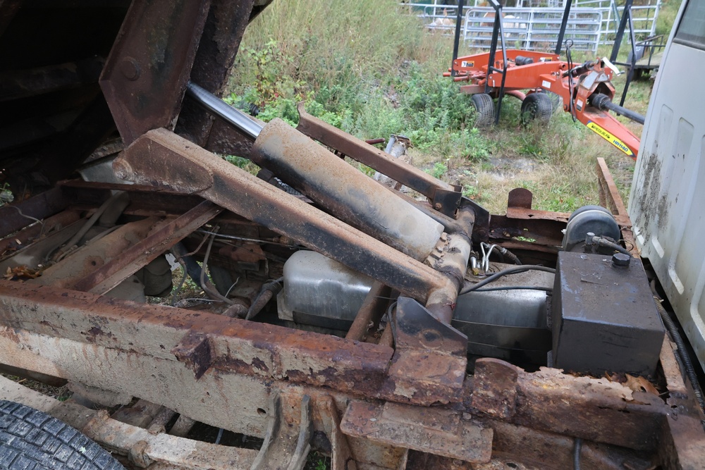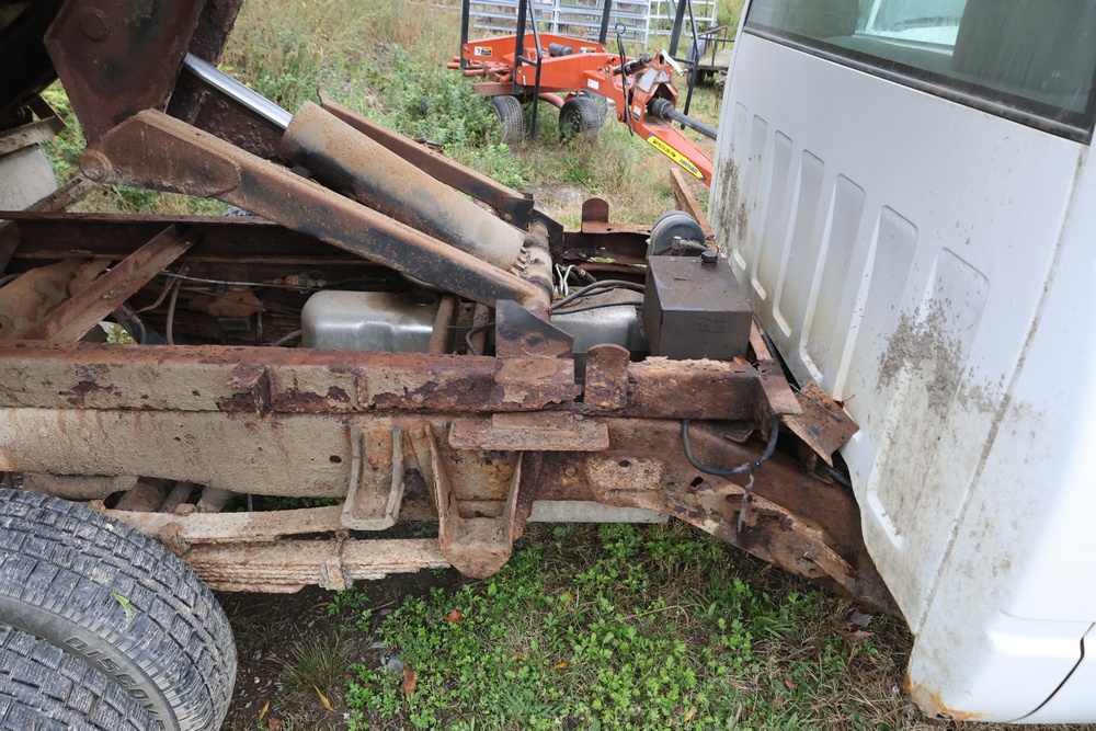 2000 GMC dump truck with a 6.5L V8 OHV 16V TURBO DIESEL engine, automatic transmission, and 4WD. VIN: 1GDJK34F9YF431472. Odometer reading: 21,396. Exterior: White cab with Dejana dump body. Interior: Bench seat, manual windows, auxiliary control box mounted in the center for plow/sander control (plow and sander not included). Tire configuration: Dual rear wheels. Additional equipment includes a dump bed and front plow light brackets. Runs and drives. Title and key available.