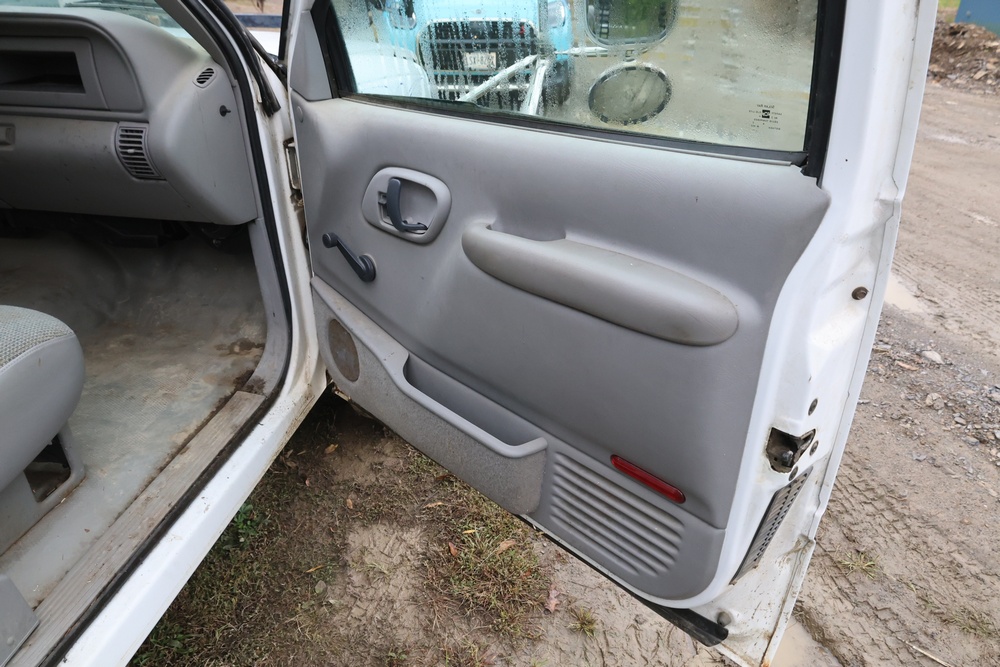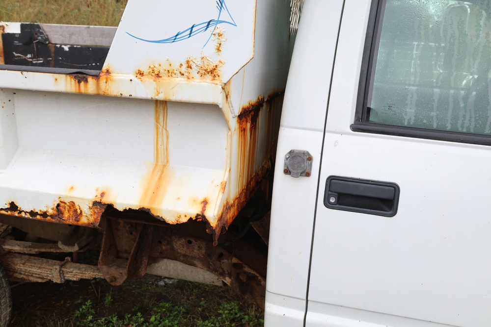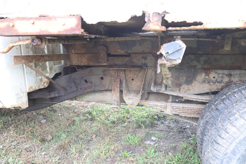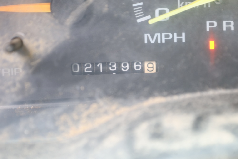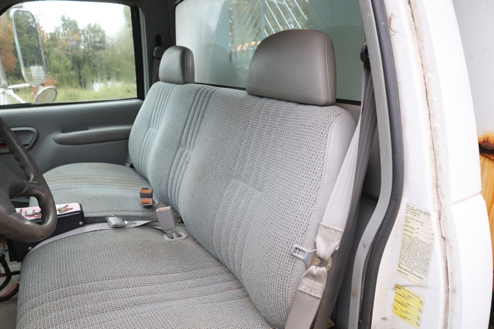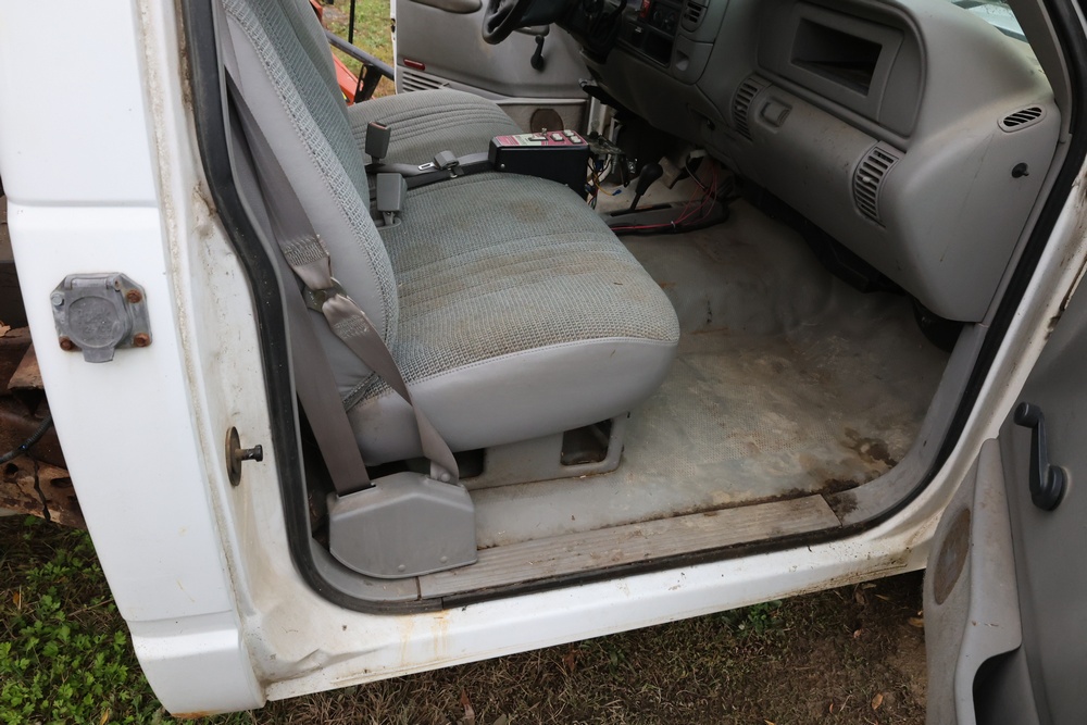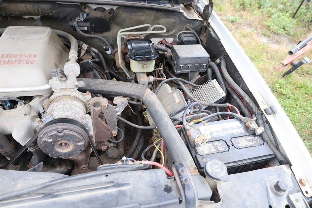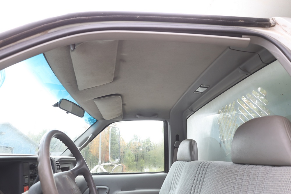 2000 GMC dump truck with a 6.5L V8 OHV 16V TURBO DIESEL engine, automatic transmission, and 4WD. VIN: 1GDJK34F9YF431472. Odometer reading: 21,396. Exterior: White cab with Dejana dump body. Interior: Bench seat, manual windows, auxiliary control box mounted in the center for plow/sander control (plow and sander not included). Tire configuration: Dual rear wheels. Additional equipment includes a dump bed and front plow light brackets. Runs and drives. Title and key available.