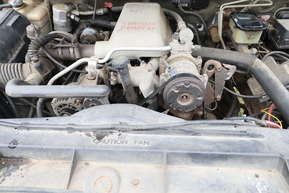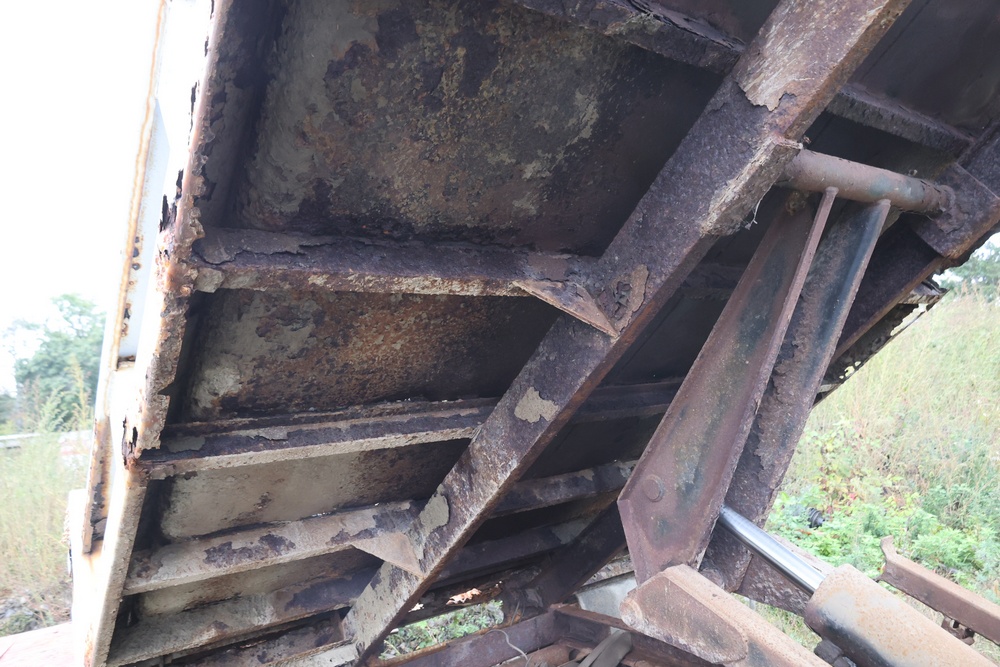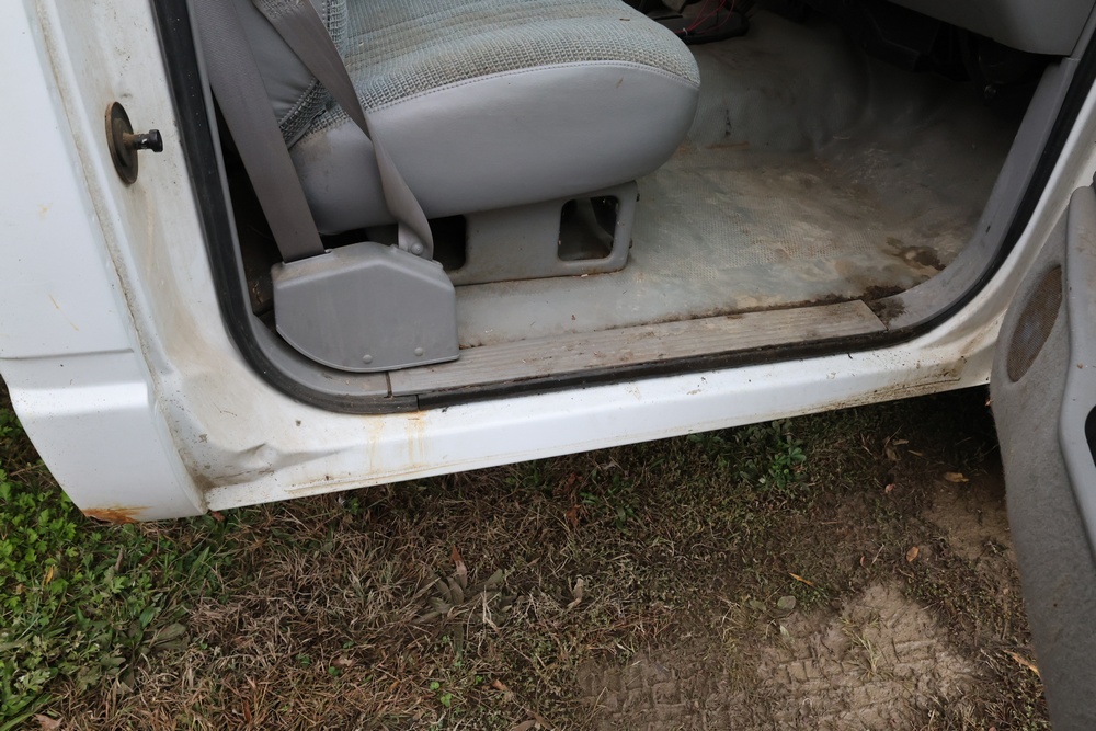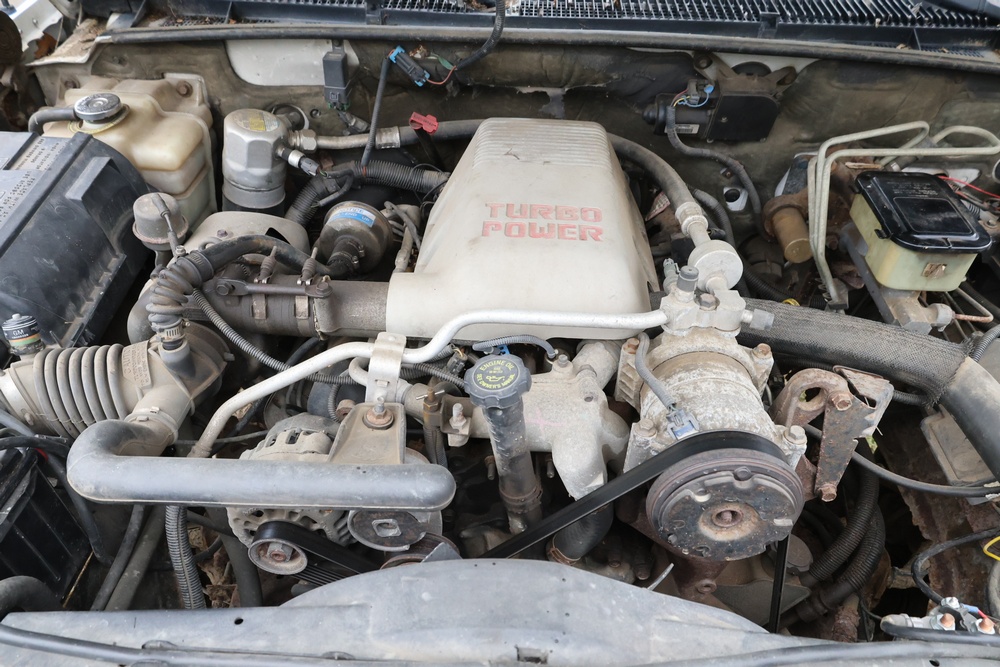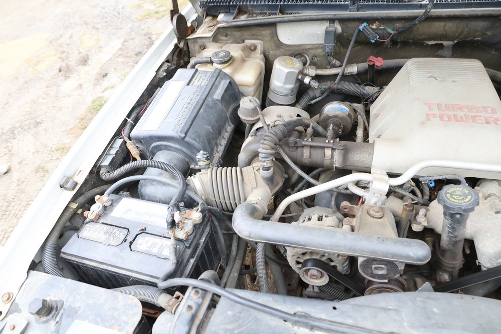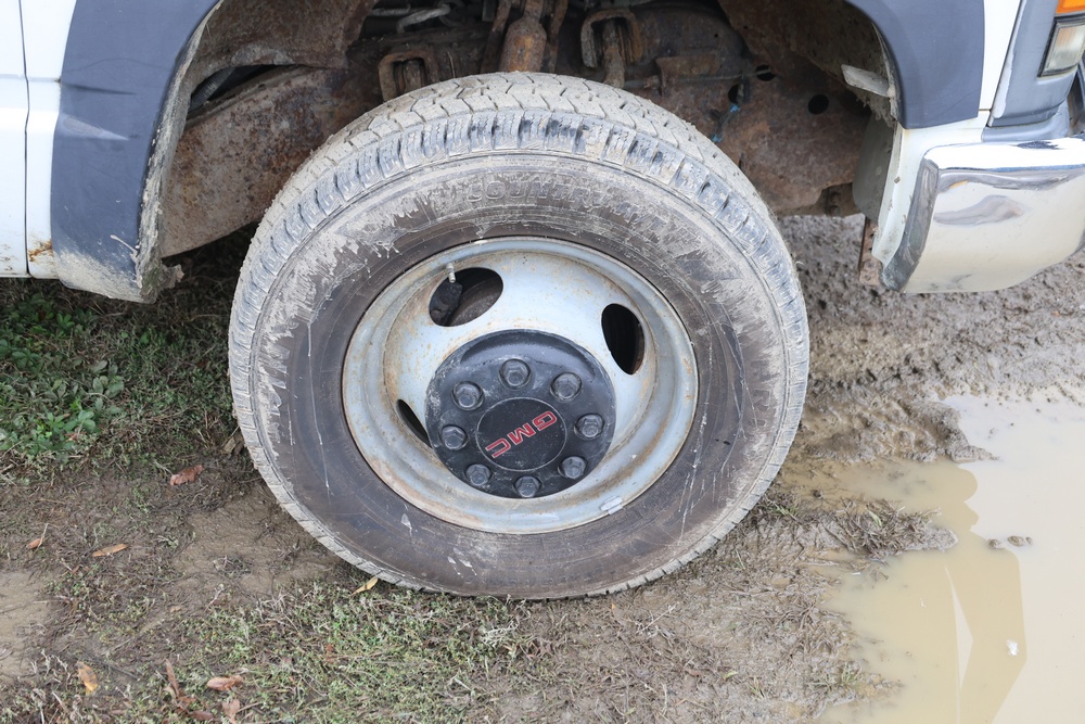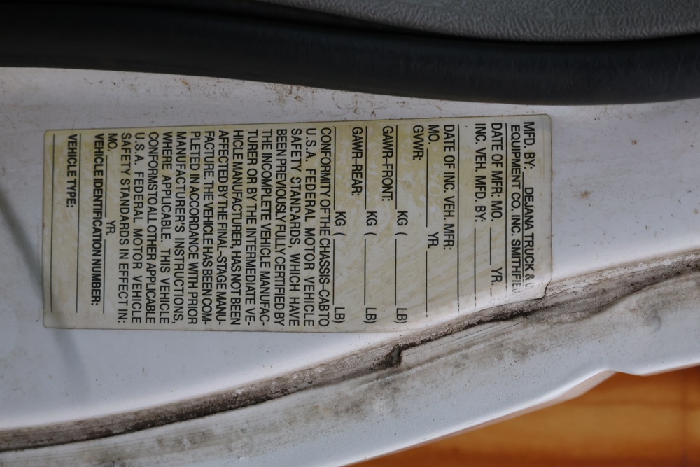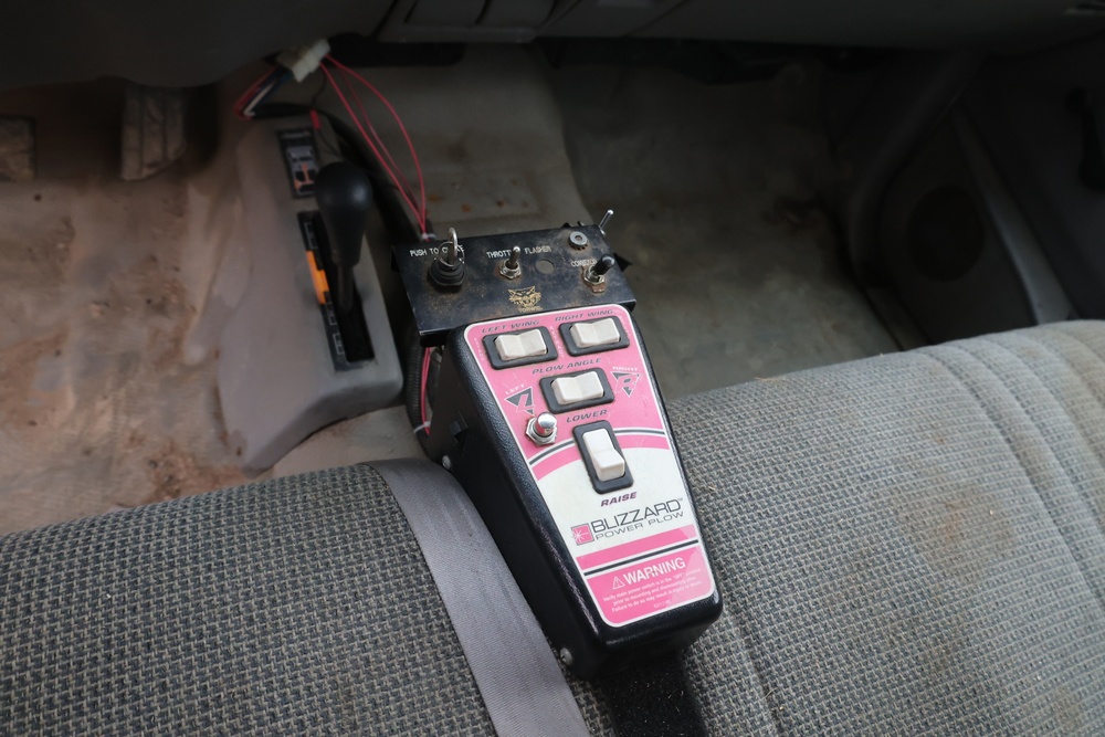 2000 GMC dump truck with a 6.5L V8 OHV 16V TURBO DIESEL engine, automatic transmission, and 4WD. VIN: 1GDJK34F9YF431472. Odometer reading: 21,396. Exterior: White cab with Dejana dump body. Interior: Bench seat, manual windows, auxiliary control box mounted in the center for plow/sander control (plow and sander not included). Tire configuration: Dual rear wheels. Additional equipment includes a dump bed and front plow light brackets. Runs and drives. Title and key available.
