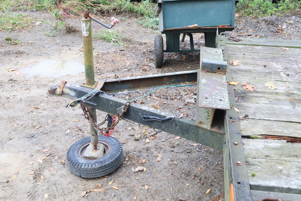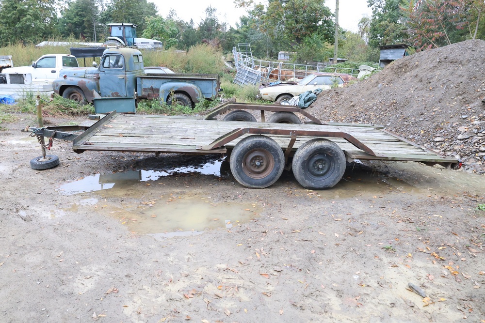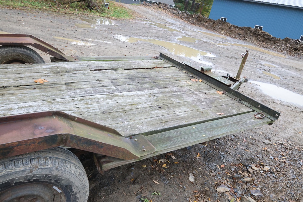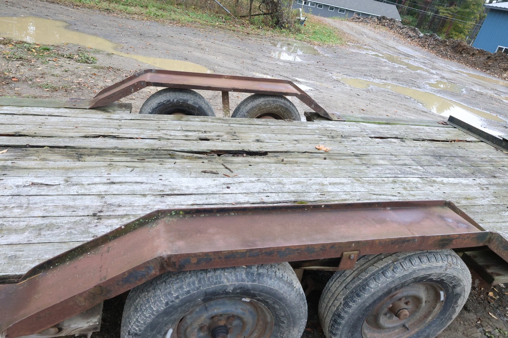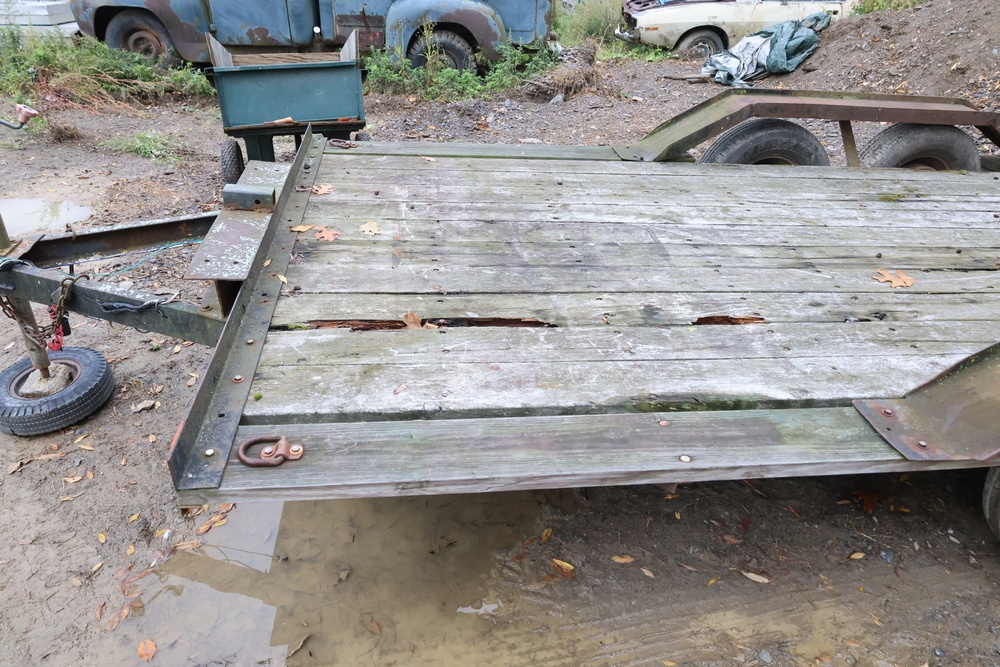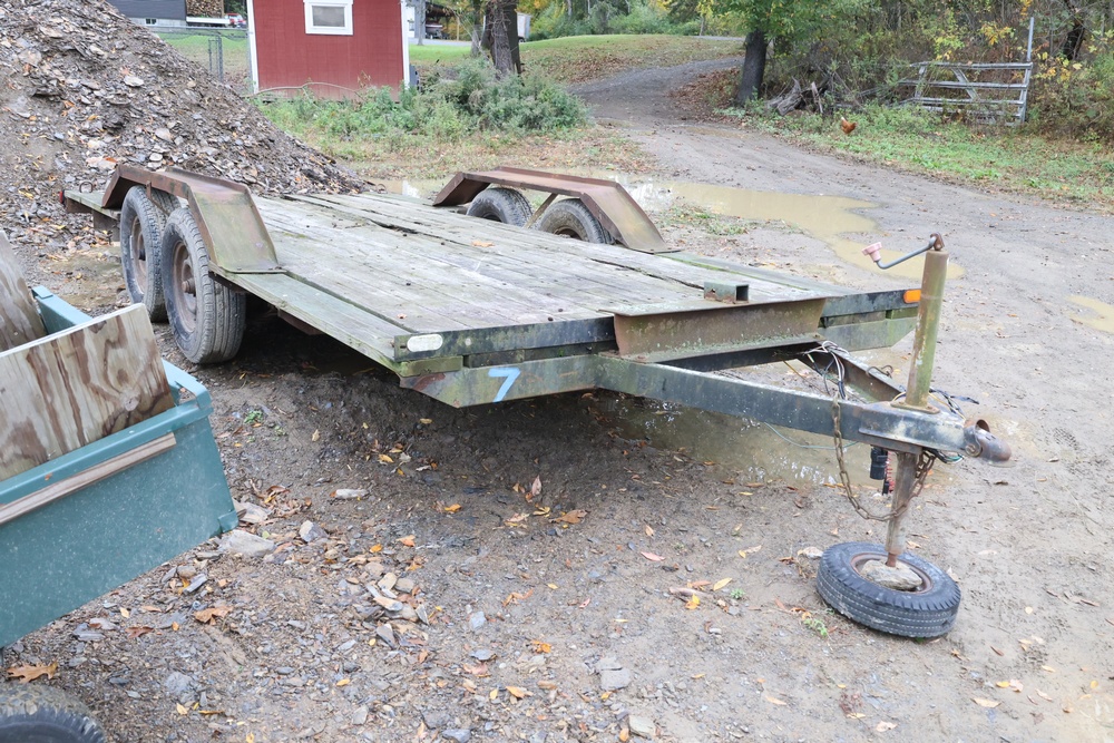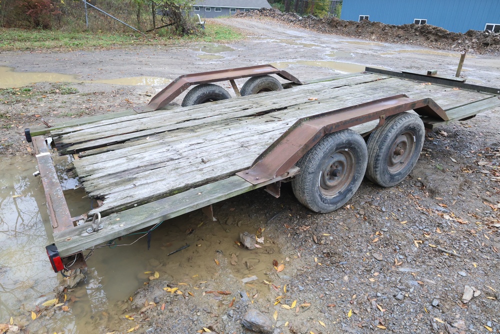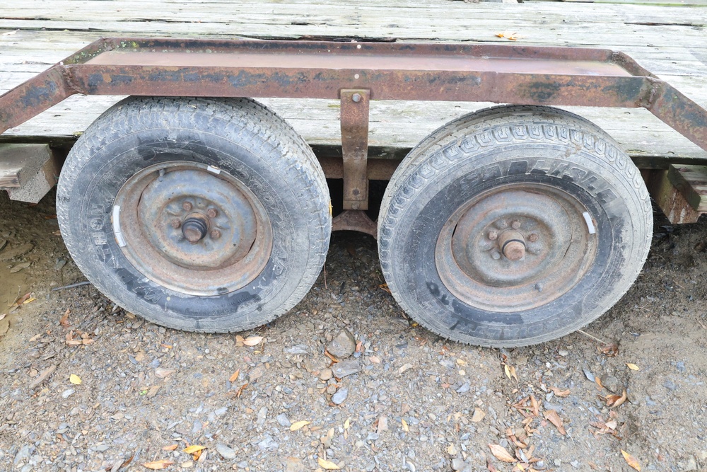 Dual-axle flatbed equipment trailer with an approximate 91 inches wide by 193 inches long. The trailer features a wood plank deck, tandem axles, and a manual tongue jack. Bill of sale only.