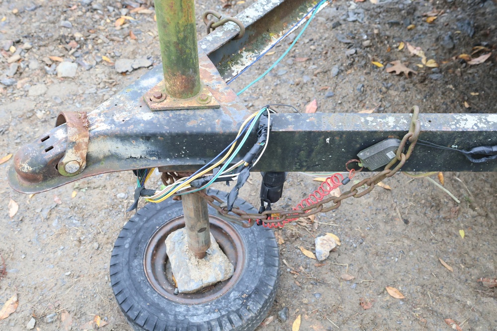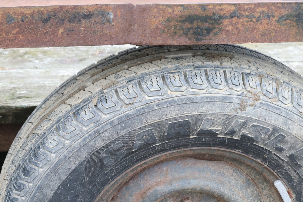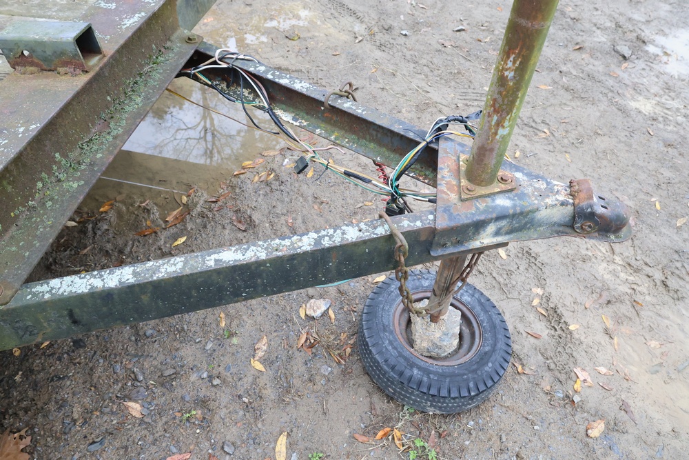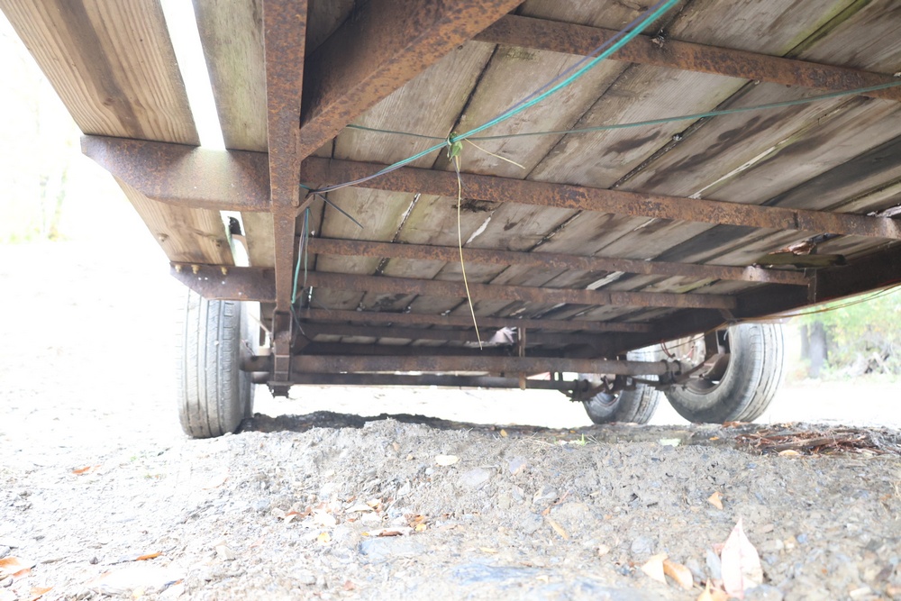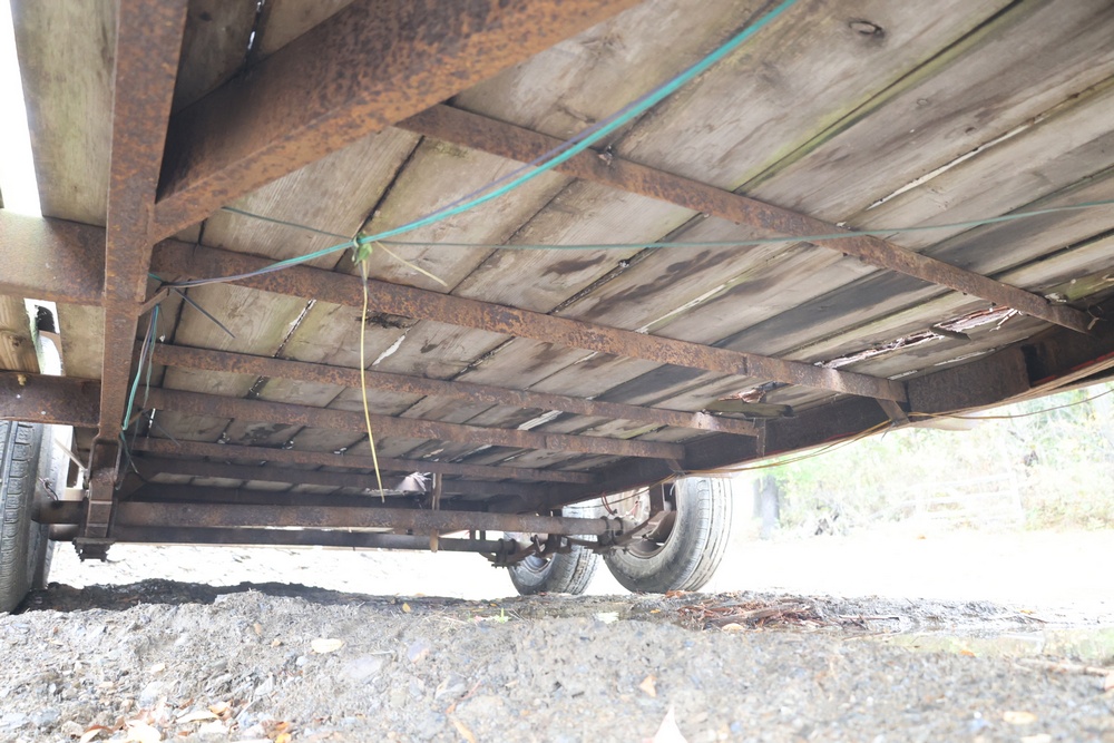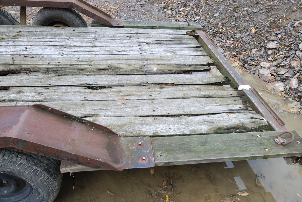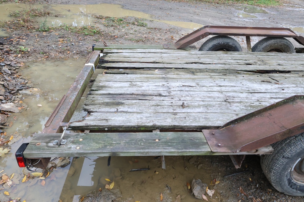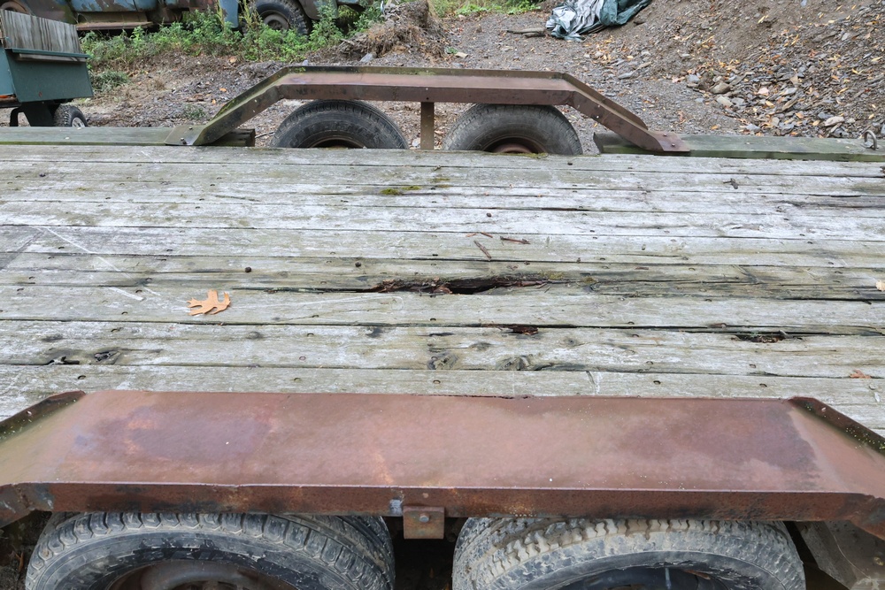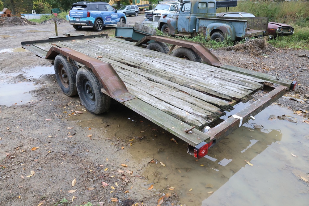 Dual-axle flatbed equipment trailer with an approximate 91 inches wide by 193 inches long. The trailer features a wood plank deck, tandem axles, and a manual tongue jack. Bill of sale only.