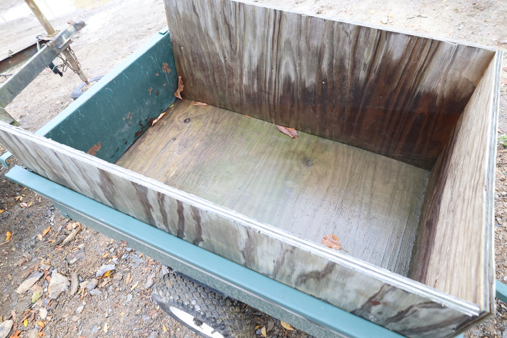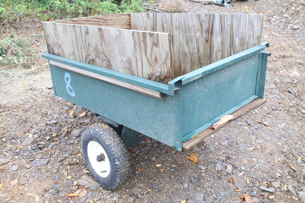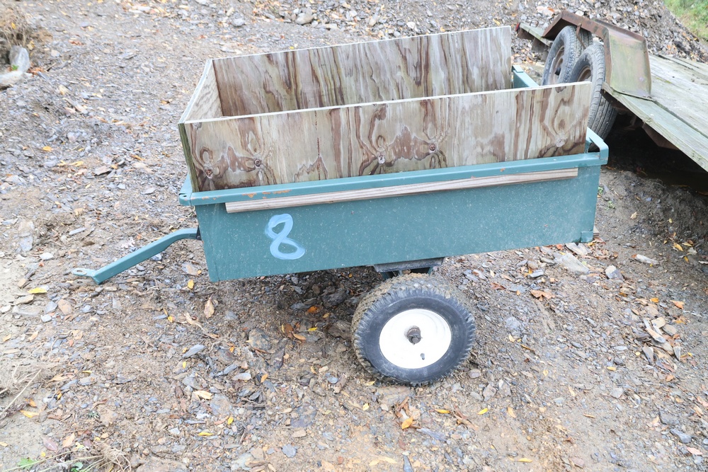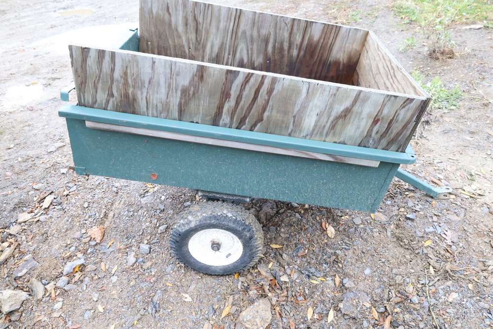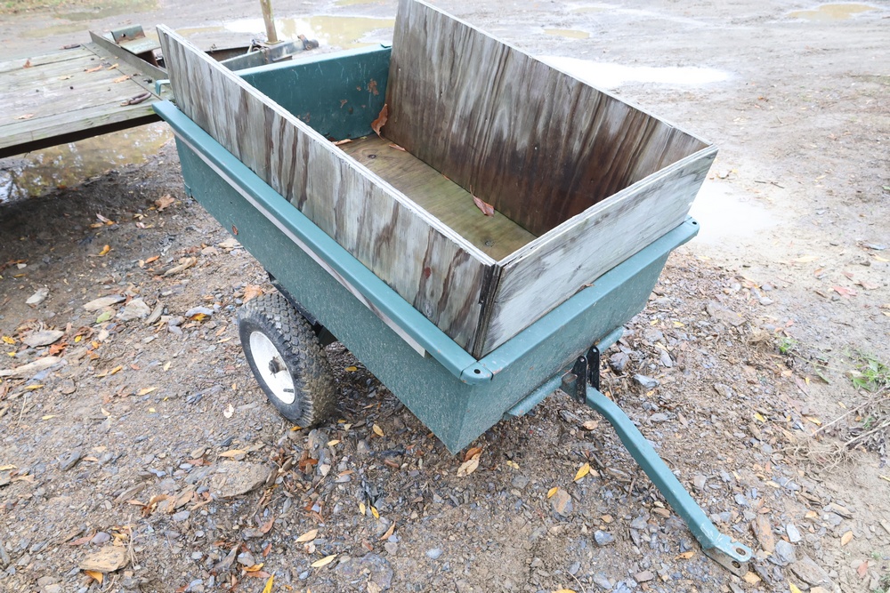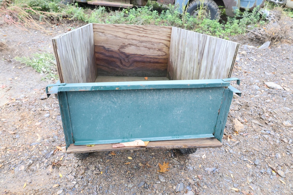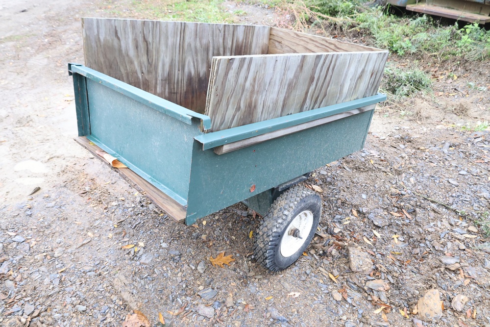 Green metal utility cart with wooden side extensions and pneumatic turf tires. The cargo bed measures approximately 32 inches wide by 48 inches long. It features a manual tow-bar style hitch for pulling behind a lawn tractor or ATV. The cart has a reinforced metal frame and a green painted exterior, with wood planks forming the removable side panels to increase hauling capacity.