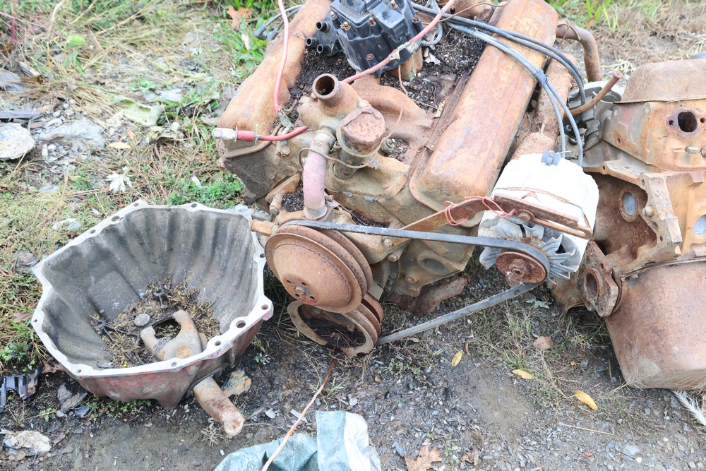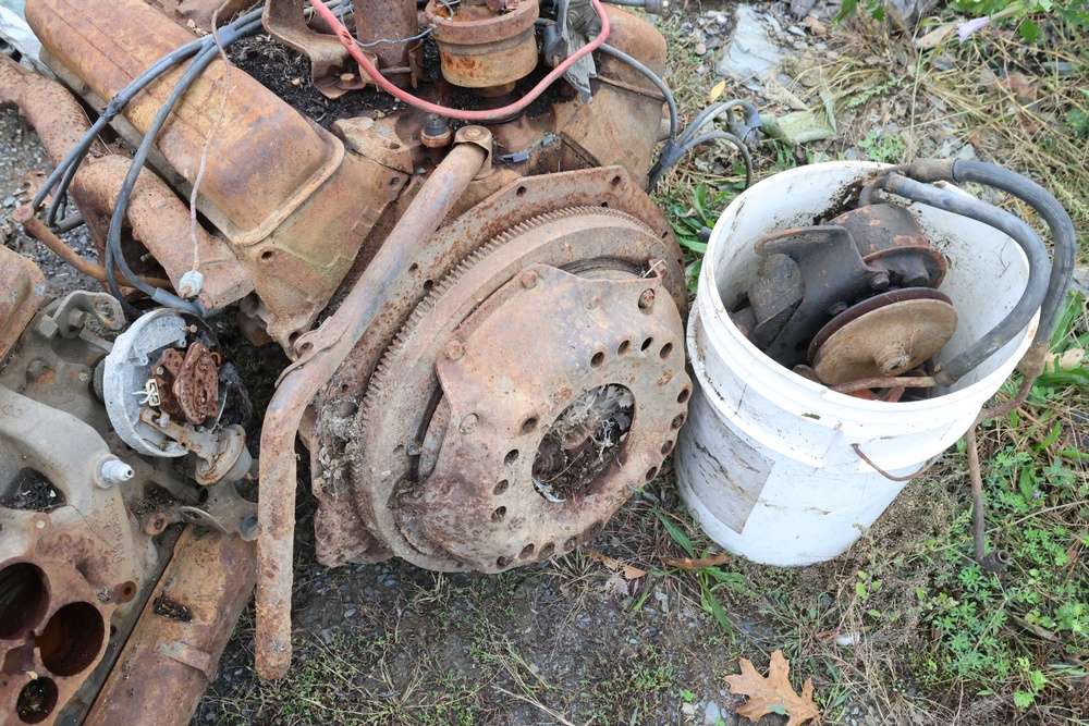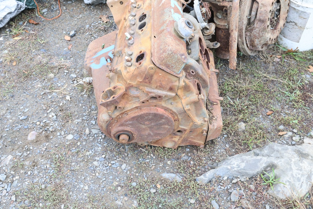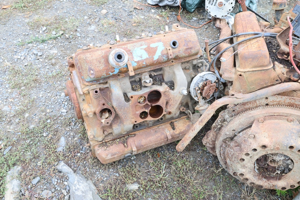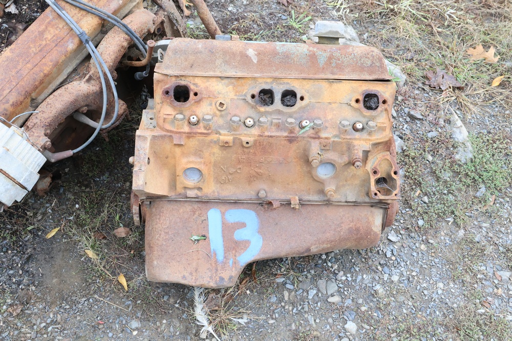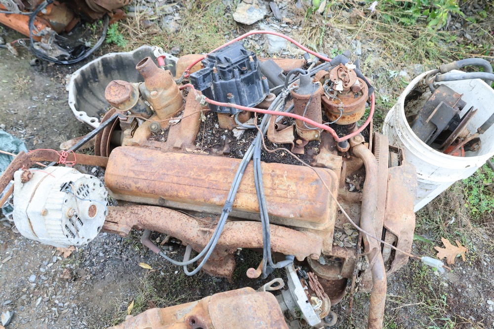 Automotive engines and engine parts in various states of wear and rust. Includes multiple types of engine blocks, cylinder heads, and accessories as shown. Suitable for parts, repair, or restoration. Three Chevrolet motors including 265, 283, one unknown.
