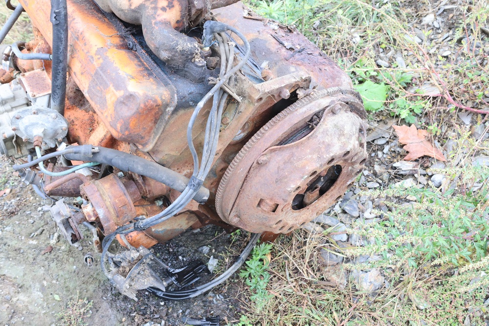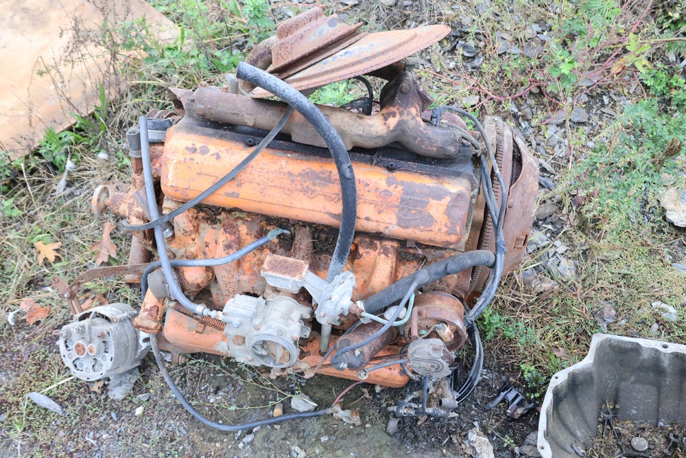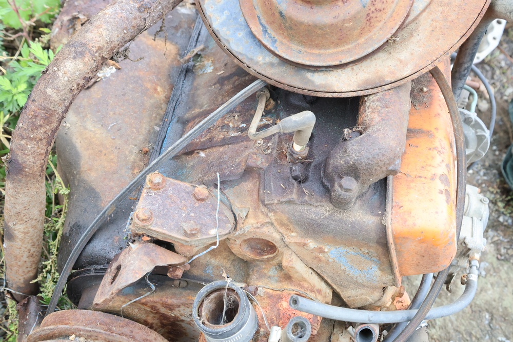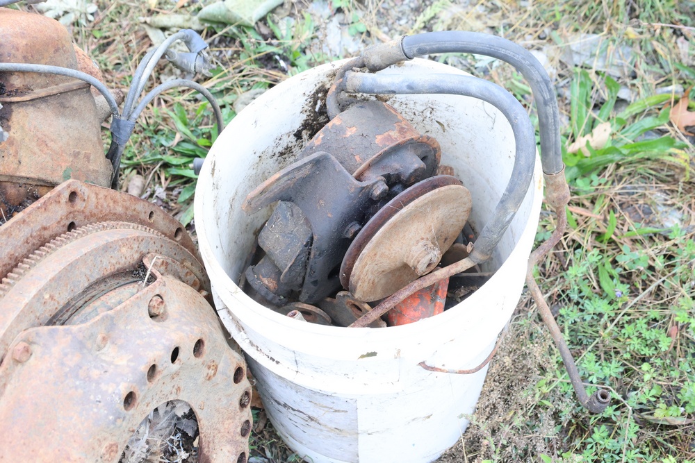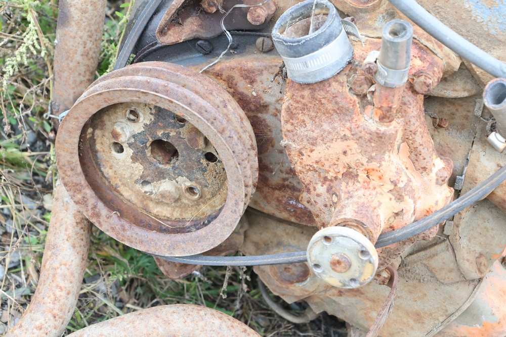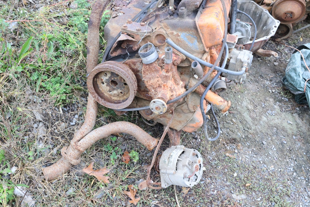 Automotive engines and engine parts in various states of wear and rust. Includes multiple types of engine blocks, cylinder heads, and accessories as shown. Suitable for parts, repair, or restoration. Three Chevrolet motors including 265, 283, one unknown.