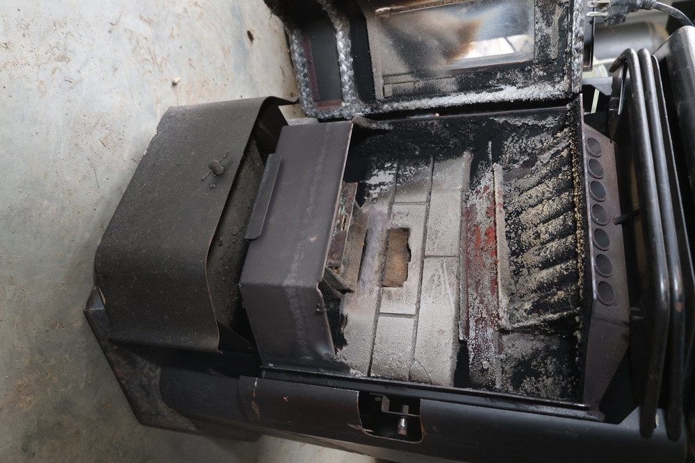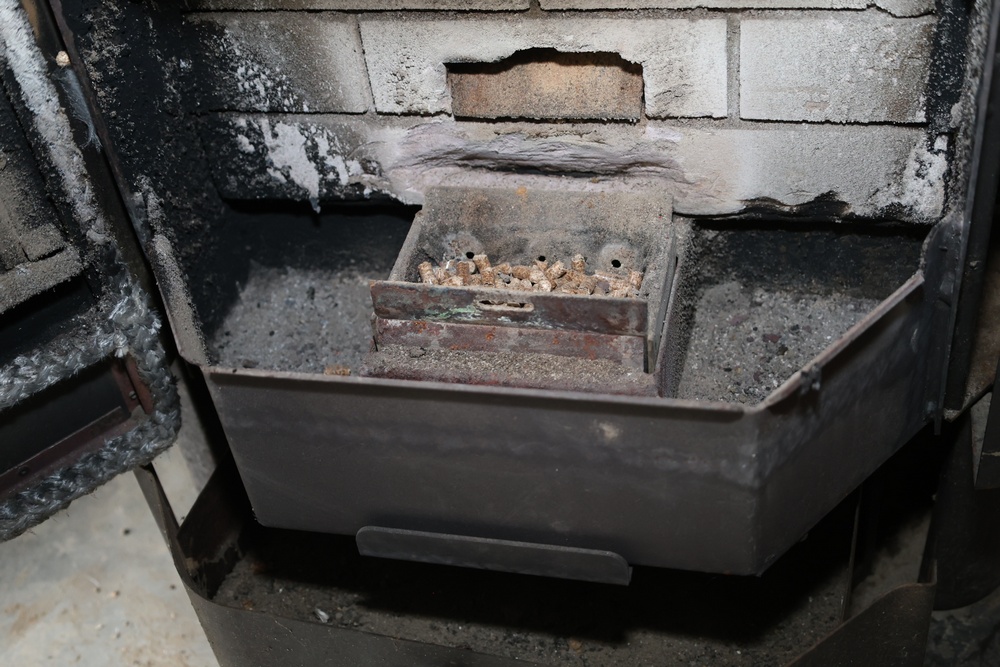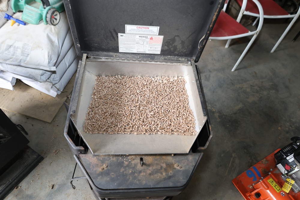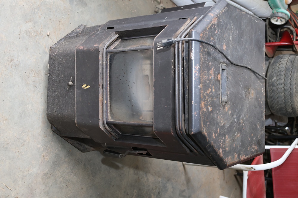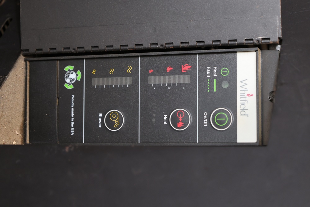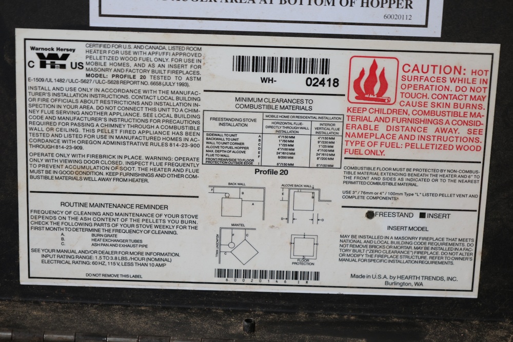 Whitfield pellet stove, model Profile 20, manufactured by Hearth Trends Inc., Burlington, Washington, listed for use with pelletized wood fuel only. The unit includes an integrated control panel with blower and heat settings, On/Off and Heat Fault indicators, and a top-loading pellet hopper. Certified under UL1482/ULC-S627 standards for residential and mobile home installation with Freestand or Insert configurations. Rated for 115V, 60Hz electrical supply and fuel consumption of approximately 1.5–3.8 lbs./hr. (nominal). Control panel turns on, functionality not tested.