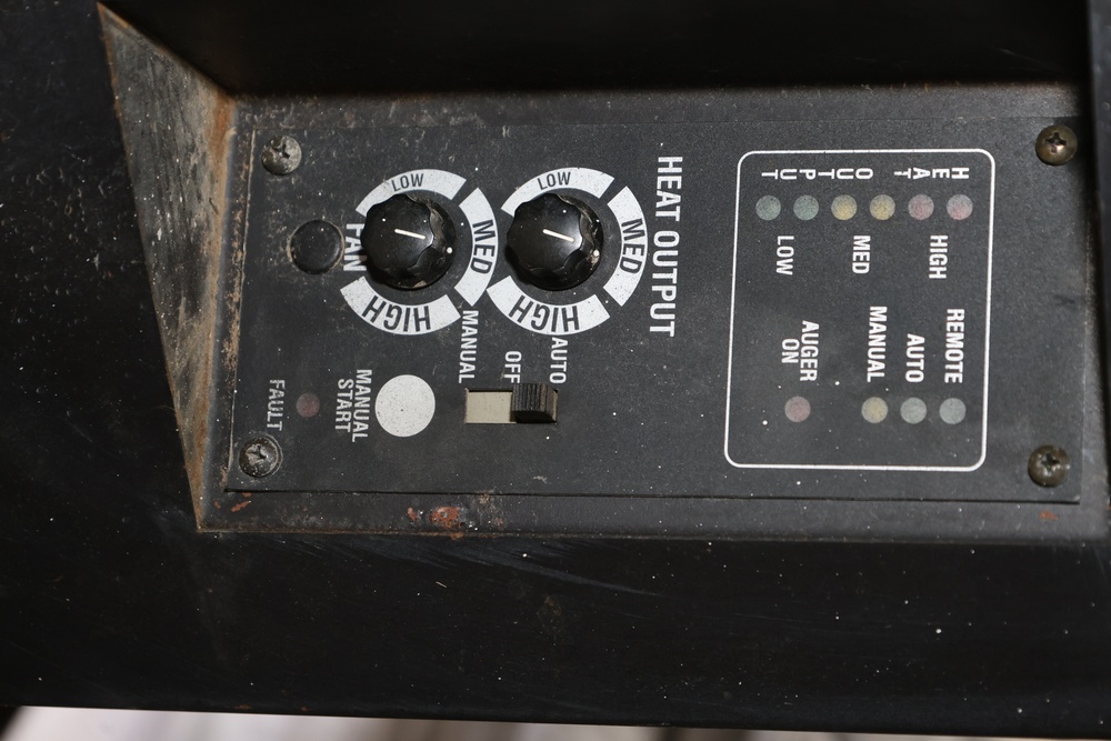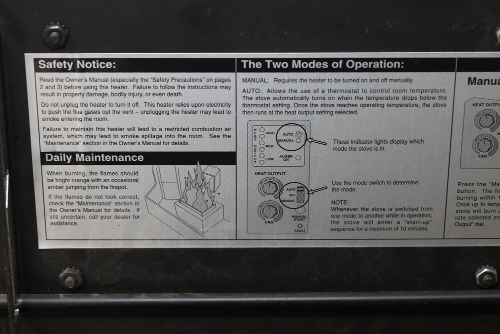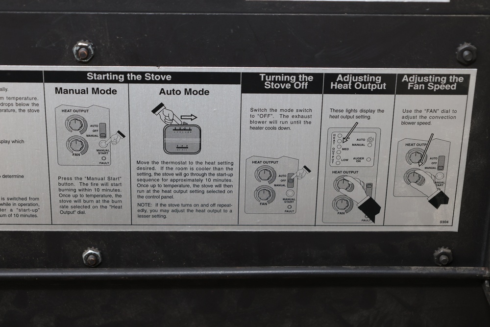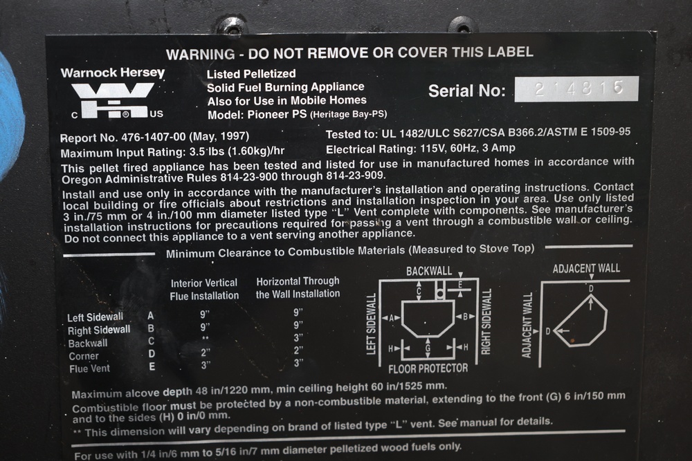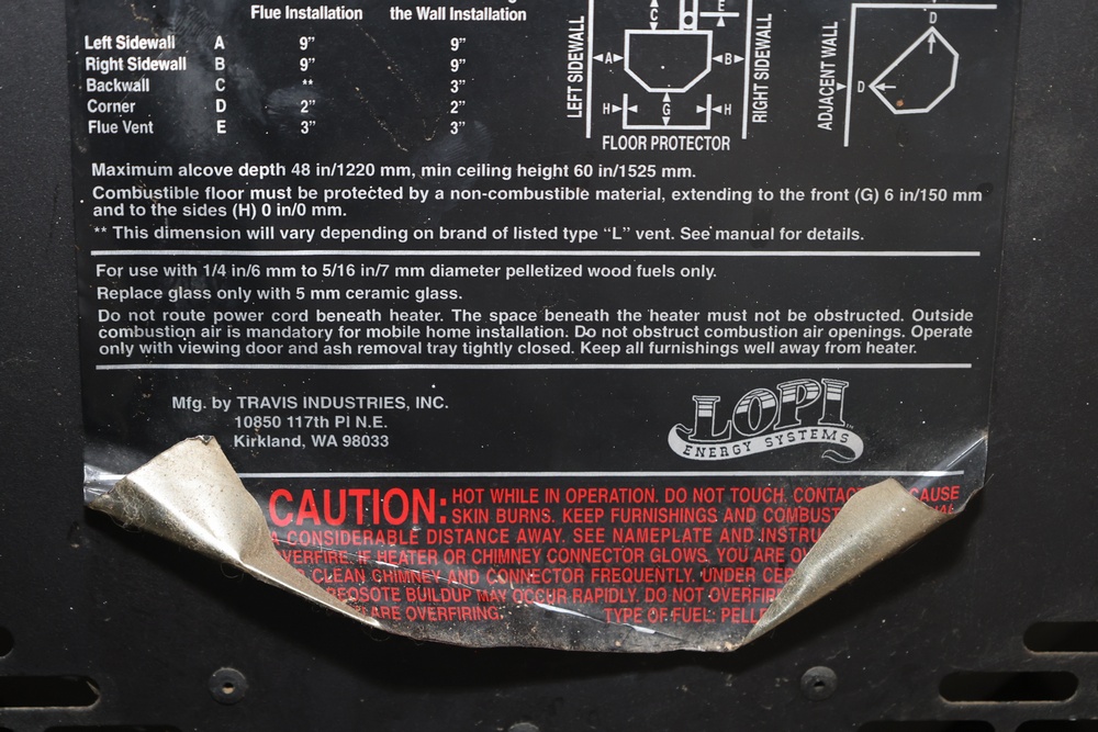 Lopi Pioneer PS pellet stove manufactured by Travis Industries, Inc., Kirkland, Washington, serial no. 214815. This listed pelletized solid fuel burning appliance is rated for 115V, 60Hz, 3A electrical input and a maximum fuel rate of 3.5 lbs./hr. Equipped with manual and automatic operating modes, adjustable fan and heat output controls, and indicator lights for auger and temperature settings. Designed for use in residential or mobile home installations with 3" or 4" Type “L” venting and clearances as specified on the unit label. Control panel turns on, functionality not tested.