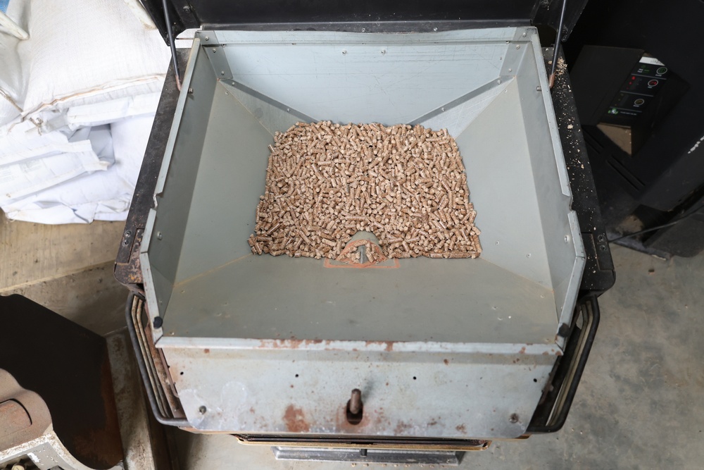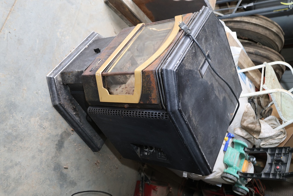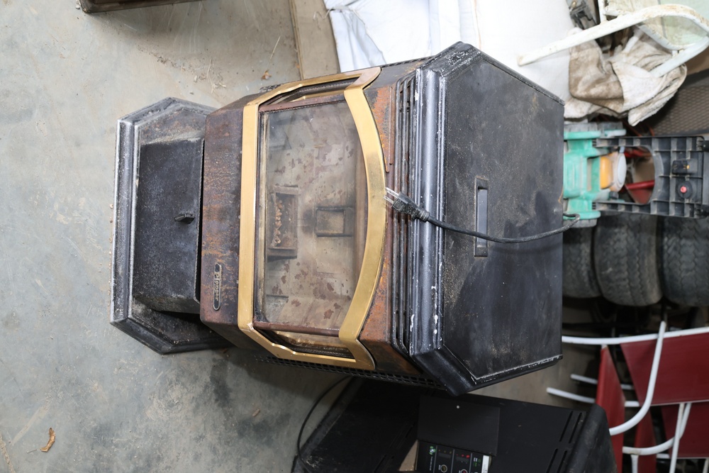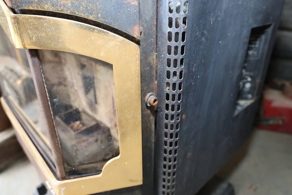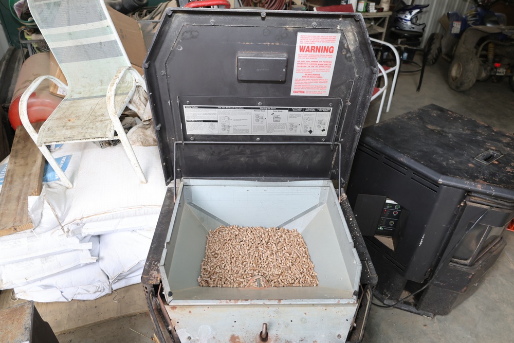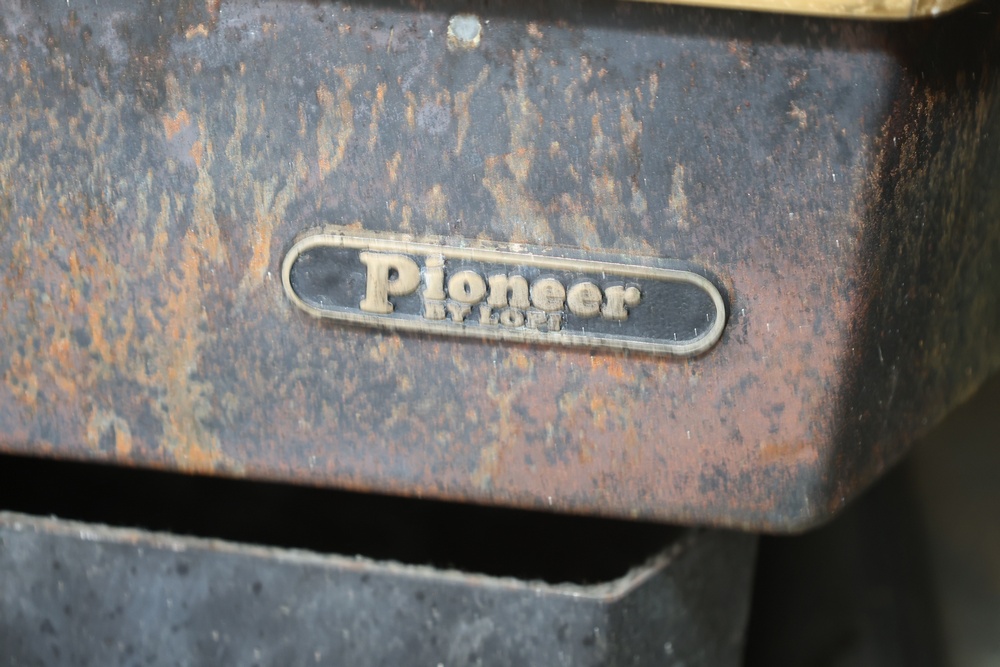 Lopi Pioneer PS pellet stove manufactured by Travis Industries, Inc., Kirkland, Washington, serial no. 214815. This listed pelletized solid fuel burning appliance is rated for 115V, 60Hz, 3A electrical input and a maximum fuel rate of 3.5 lbs./hr. Equipped with manual and automatic operating modes, adjustable fan and heat output controls, and indicator lights for auger and temperature settings. Designed for use in residential or mobile home installations with 3" or 4" Type “L” venting and clearances as specified on the unit label. Control panel turns on, functionality not tested.