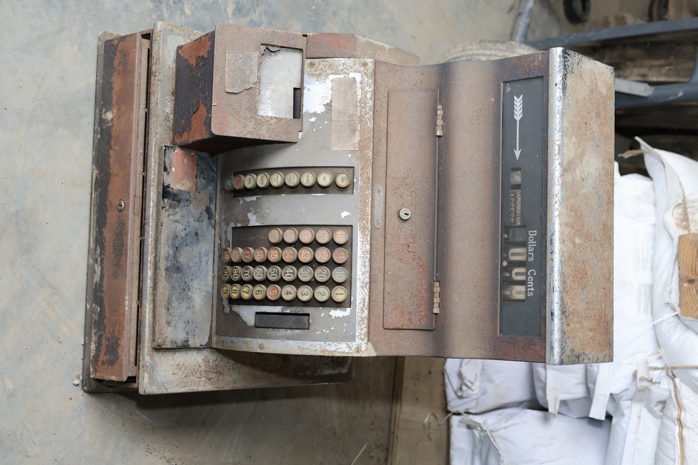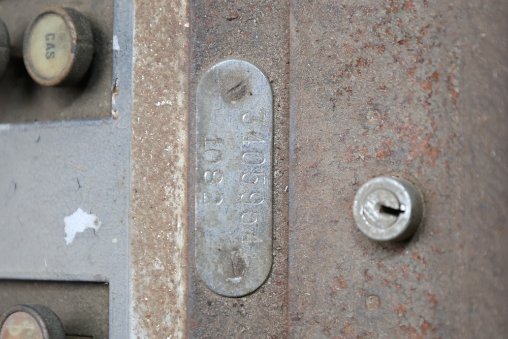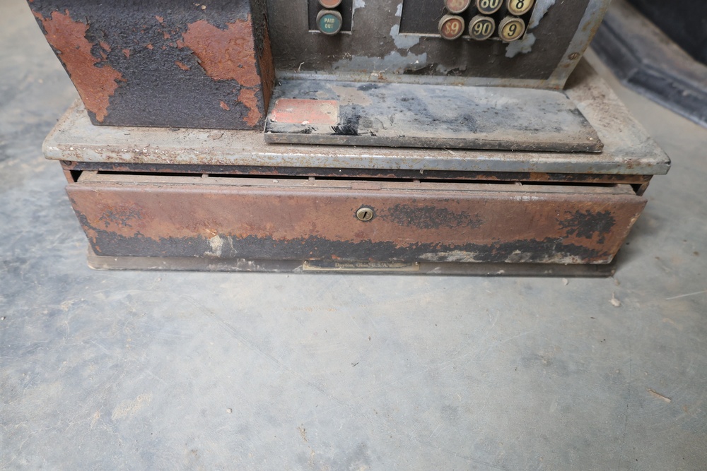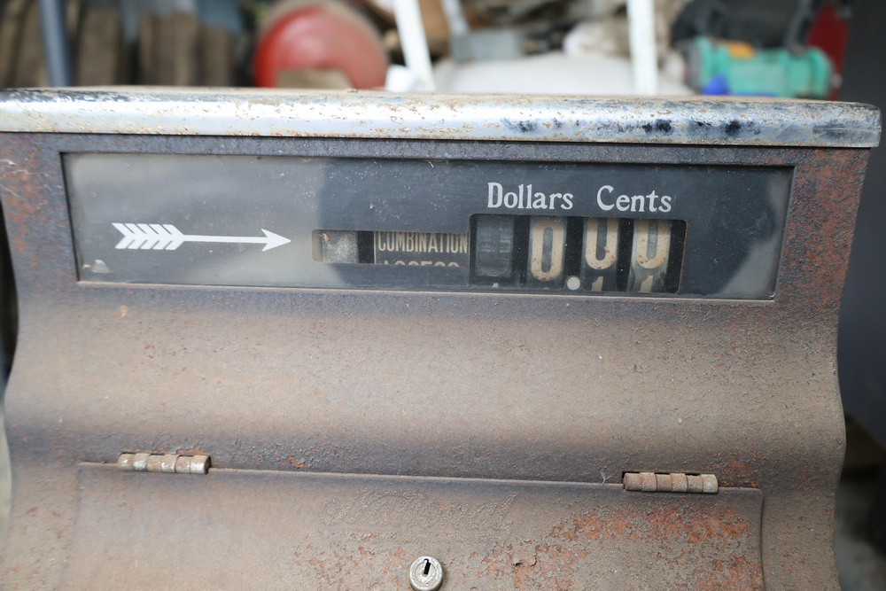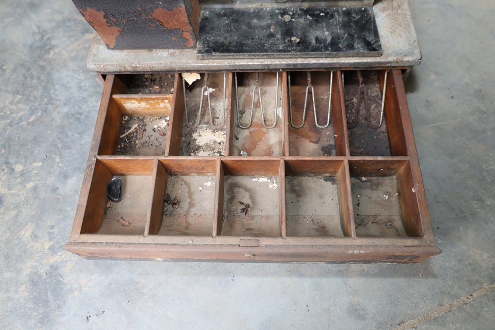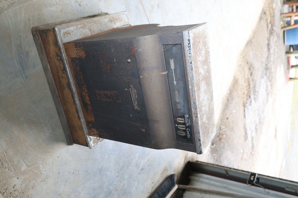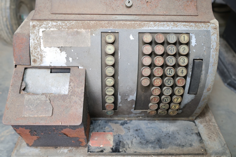 National cash register, number 3405951-1082, featuring a mechanical key-operated design with numeric and category buttons labeled for sales types including gas, oil, grease, tires, and accessories. The display shows dollars and cents through a mechanical counter window. Constructed with a metal body and mounted on a wooden cash drawer with coin and bill compartments. No key.