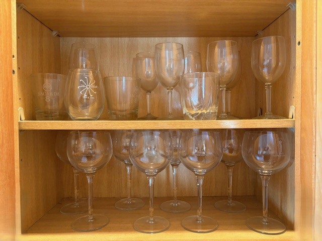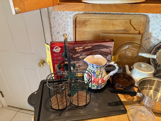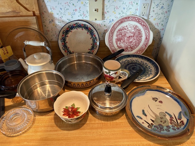 Kitchen Entertaining, featuring Polish Pottery. Incl: 15 wine glasses (incl set/8 red wine); two Polish Pottery plates, ea. 10"diam; cutting boards; tea kettle; pots; pans; bowls; linens; Tupperware cake carrier with handle. See photos for more details.