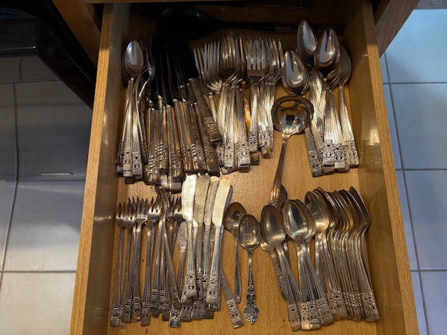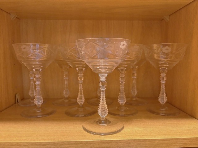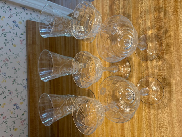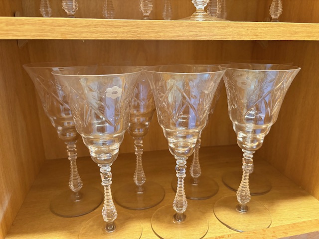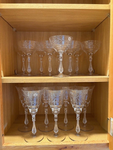 Crystal and Flatware. Community stainless service of 12 with additional serving pieces (matches serving spoons in lot #3); 24-piece etched crystal vintage glasses. See photos for details.