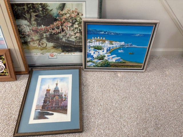 Wall Art. Seven pieces plus stained glass Welcome sign: all framed, most matted & behind glass (some signed), largest wall art, 29.5"Wx38"H; wood framed, stained glass welcome sign, 38.5"Wx6"H. See photos for details.