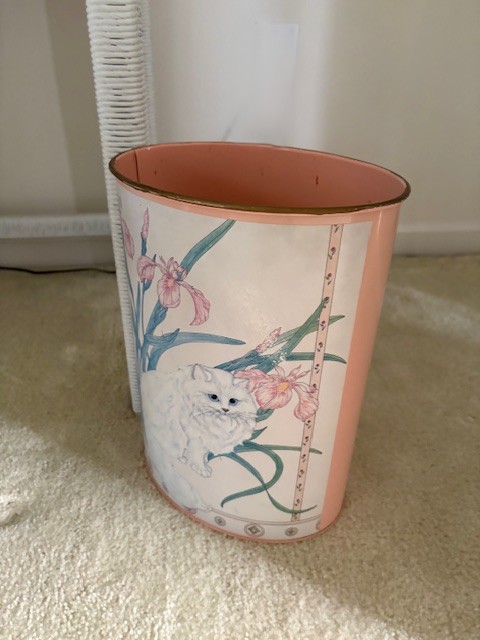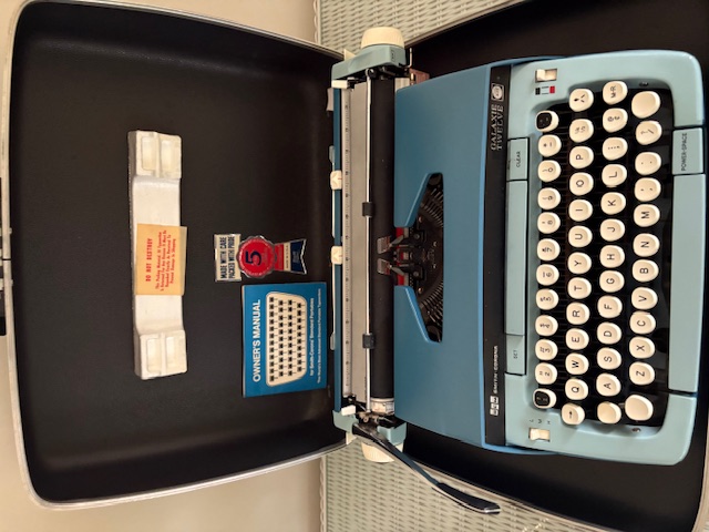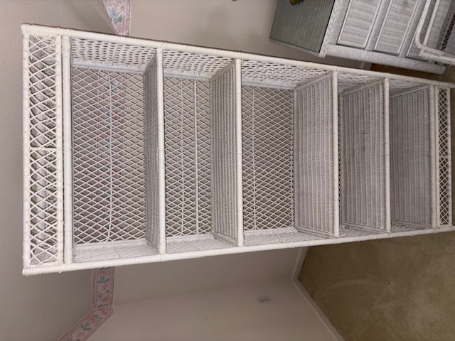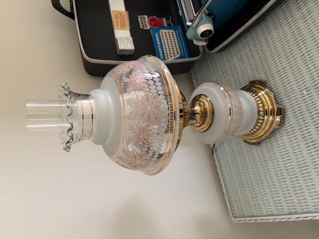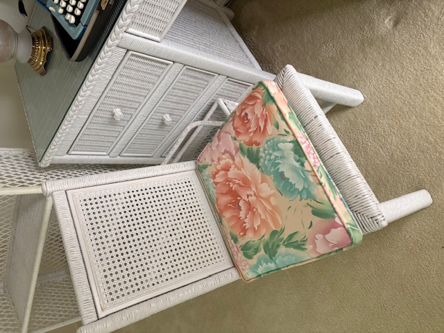 Wicker Desk, Bookshelf, Typewriter, Lamp. White wicker 4-drawer desk, 46"Wx19.5"Dx29.5"H; white painted desk chair; tall white wicker five-shelf unit, 28"Wx13"Dx72"H; vintage table lamp with glass shade & hurricane globe; Smith Corona typewriter XII in travel case; trash pail.