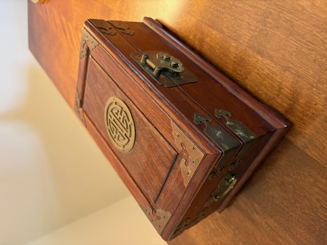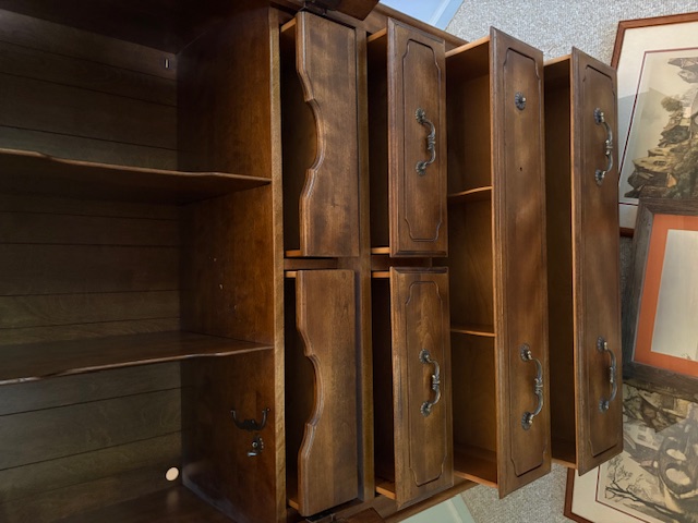 Ethan Allen Armoire Cabinet, Décor. Clothing armoire, 41"Wx19.5"Dx57.5"H with dovetailed drawer (one handle detached, included); brass adjustable arm table lamp; wood box with brass HW (Asian influence); three prints (largest 17"Wx21.5"H). See photos for more details.