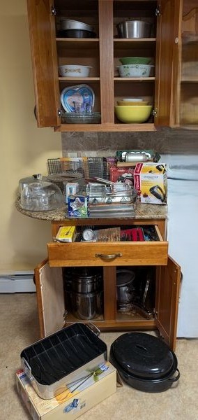 Vintage Kitchen Bakeware and Cookware, featuring Pyrex. Colorful mixing bowls; Pyrex pie dishes & bakers; covered cake dish; counter & hand appliances, including Spritz cookie maker; cooling racks; assorted knives & utensils; two large roasting pans; assorted cookware. See photos for more details.