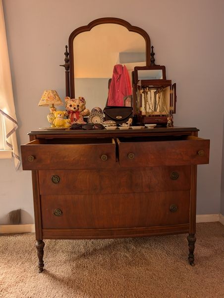 Boutique Items, Antique Dresser. Antique four-drawer (dovetailed) dresser, 42"Wx20.5"Dx3'H (note surface damage) with attached mirror, 34"Wx32"H; vintage women's coats (3); leather handbag; Quartz lead crystal clock; boudoir lamp with matching shade; vintage teddy bear coin bank; assorted jewelry, including four watches; jewelry box; antique crochet hook; two porcelain dishes; covered heart-shaped dish; other related items as seen in photos.