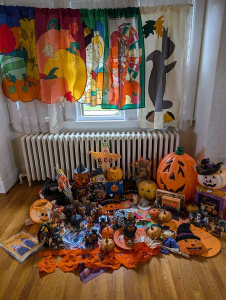 Fall Décor, featuring Halloween. Seasonal flags (one is torn); assort pumpkins (largest 24.5"H); figurines; lantern; costumes; more! See photos for quantityy & details.