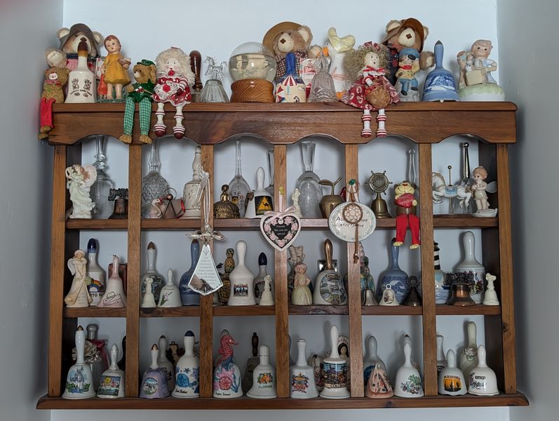 Collectibles, Wall Shelf. Very large bell collection (one of two); vintage & antique collectibles; wall display shelf, 3'Wx5.5"Dx23"H. See photos (items requires cleaning). Loc on 2nd floor,