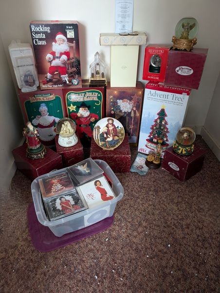 Large Christmas Décor, Music CD's. Boxed Christmas décor including Rocking Santa; Mrs. Claus, Holly Jolly Santa; Lenox glass church; musical figurines and snow globes, incl Music Box Company; The Bradford Collection ornaments (2) with certificate of auth "Guiding the Way" & "Protective Sleep"; Advent tree, 18"H; bin with holiday music CD's; other related items as seen in photos. Loc on 2nd fl.