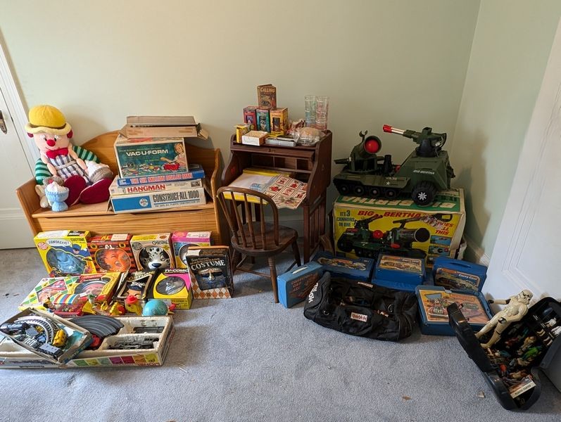 Vintage Children's Toys. Child's wood rolltop desk, 20.5"Wx11"Dx31"H with chair; wood storage bench, 42"Wx17"Dx27"H; Halloween masks in original boxes; board games; trains & tracks; remote control vehicles; Star Wars toys; antique pull string toys; "Fievel Goes West" collector's cards; large crocheted doll; collector's glasses. See photos. Loc on 2nd fl.