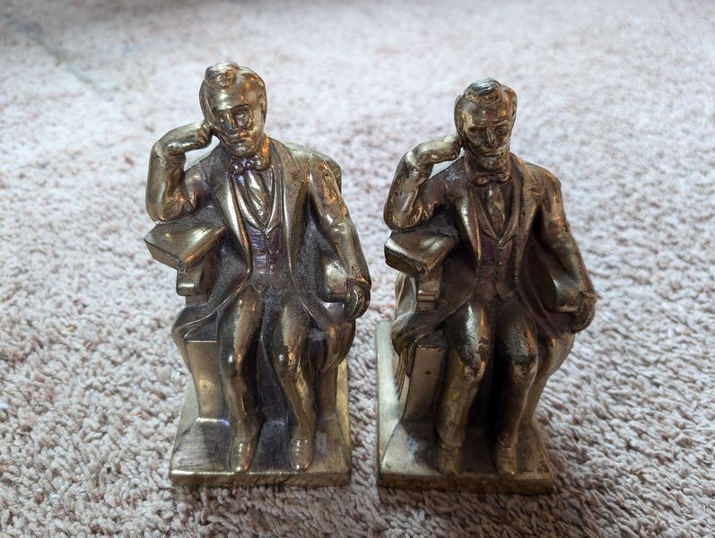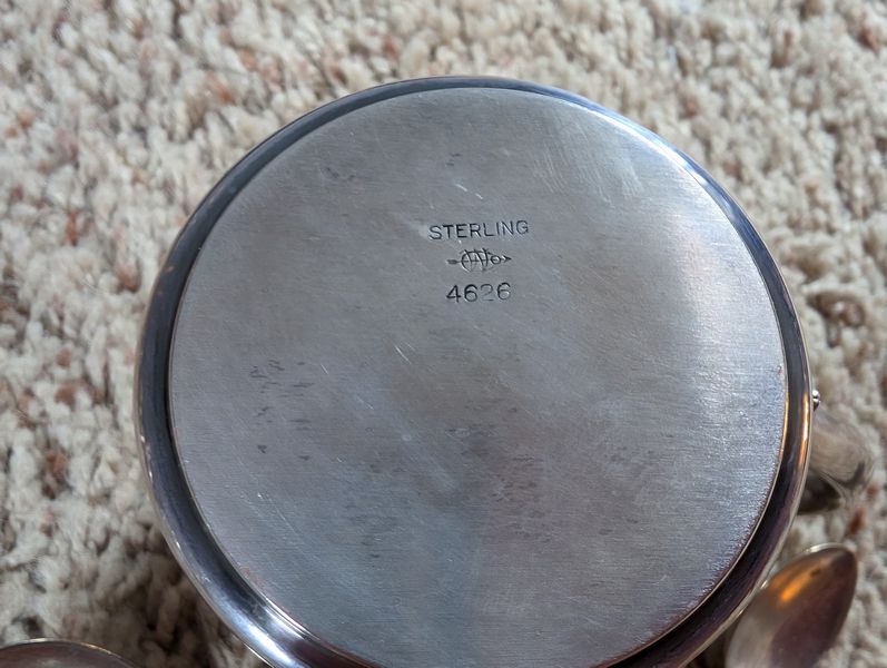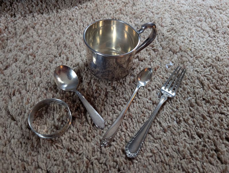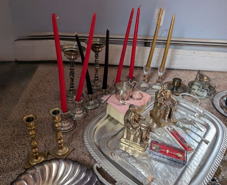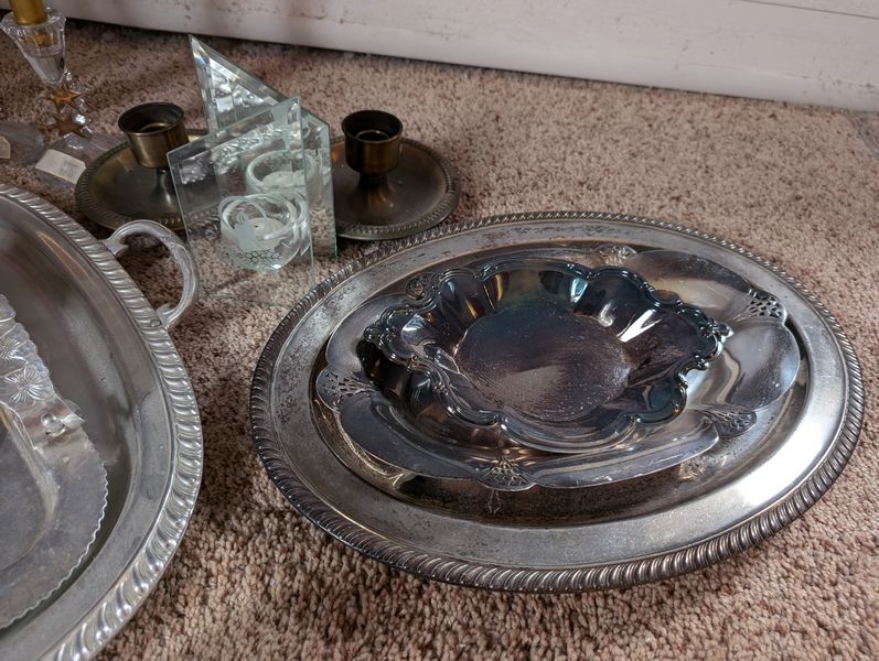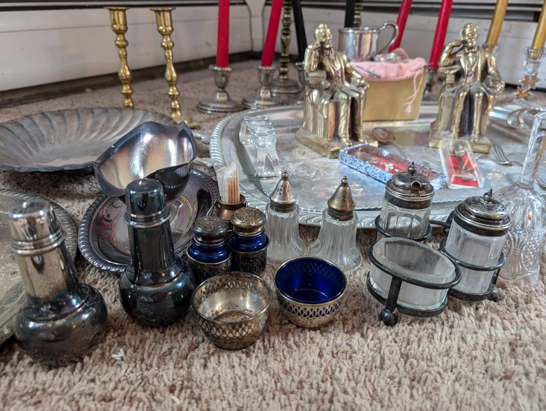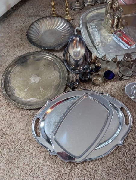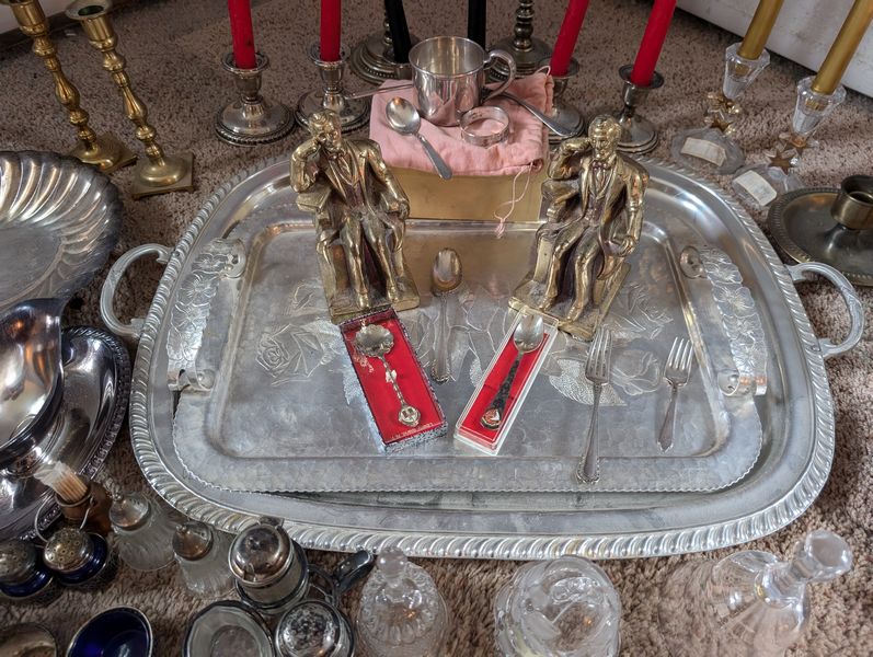 Metal Entertaining, featuring Sterling Pieces. Vintage metal entertanining pieces including silver, silver plate, brass. Candlestick holders (tallest 1'H); platters (largest 26"Lx18"W); salt & pepper; cordials; condiment; baby set; collector's spoons; bookends; more! See photos.