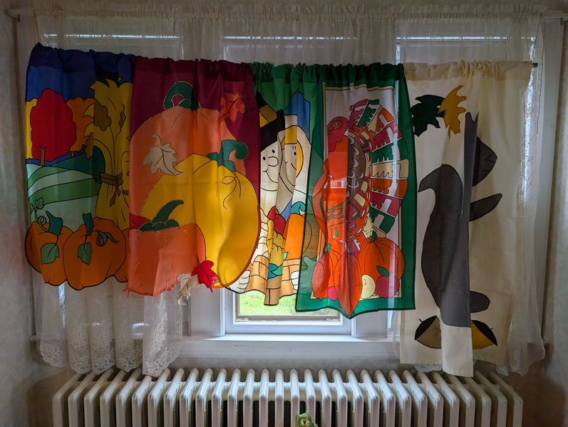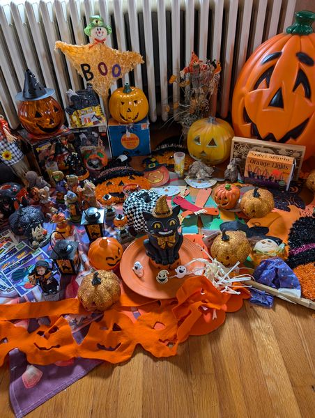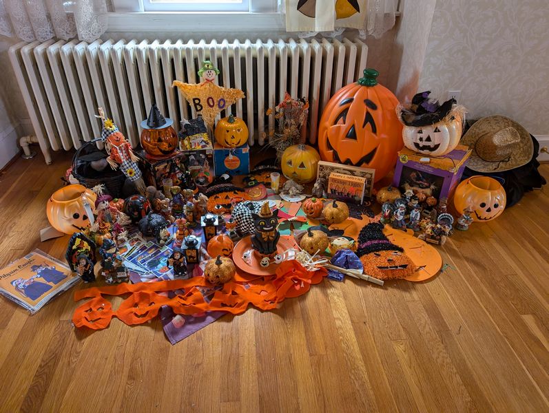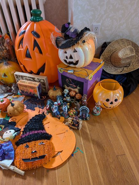Fall Décor, featuring Halloween. Seasonal flags (one is torn); assort pumpkins (largest 24.5"H); figurines; lantern; costumes; more! See photos for quantityy & details.